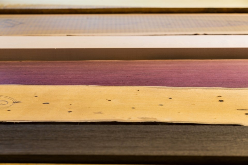 “Credo sinceramente che gran parte dei designer e degli architetti che lavorano con il legno non conoscano più di tante specie e sovente abbiamo difficoltà ad accedere ai materiali più rari”. Il percorso espositivo che ha creato è una sorta di narrazione a episodi, ognuno “impaginato” in un quadrato di parete colorato. Preziose traversine di Amoretta vengono accostate a una citazione del celebre libro Papillon, ambientato nella Guiana francese da cui proviene questa essenza; l’evocativo disegno di un albero con le radici contorte in evidenza, opera su china di Zeno Filippini, introduce al fenomeno naturale della radica mentre Cantarutti racconta la sua esperienza su uno schermo incastonato in una cornice di legno di Amaranto.
