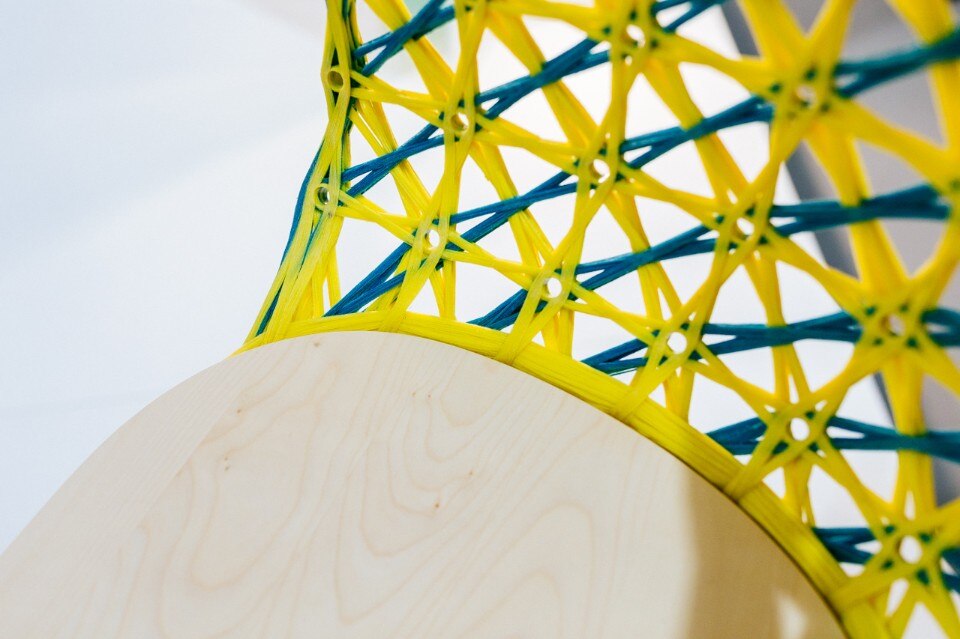 “Abbiamo lavorato su uno stampo dove abbiamo fissato delle spille seguendo un pattern a rete, per poi avvolgervi attorno il materiale a caldo”, raccontano. “I fili che intessiamo si soprappongono in quattro strati, seguendo direzioni differenti; si produce così un disegno piacevole dal punto di vista ornamentale, che può essere personalizzato a livello cromatico dosando i colori. Una volta completata questa parte della lavorazione lo stampo viene rimosso e inseriamo la seduta e le gambe”. L’impatto estetico è forte e i pezzi mantengono una certa leggerezza, senza che la stabilità venga alterata, caratteristica non trascurabile.