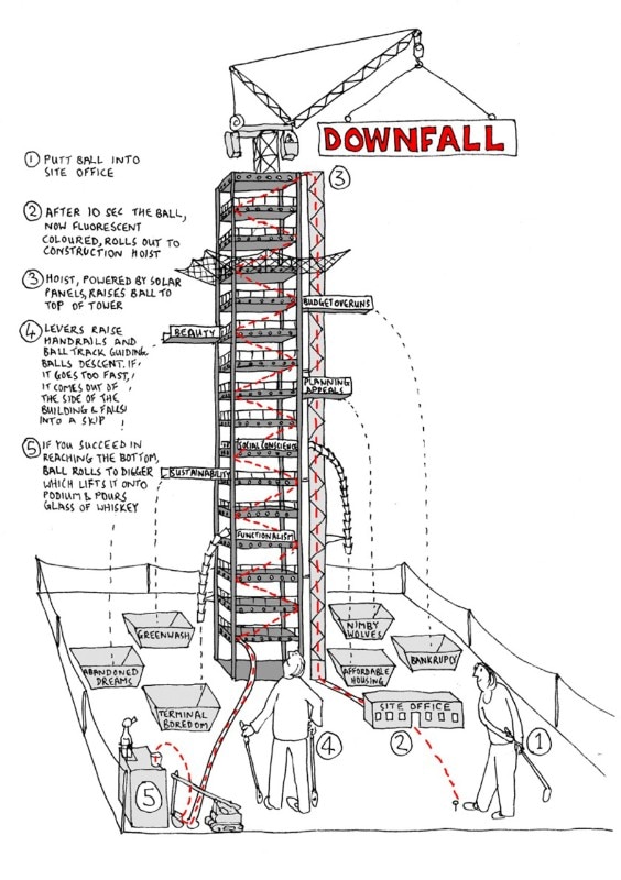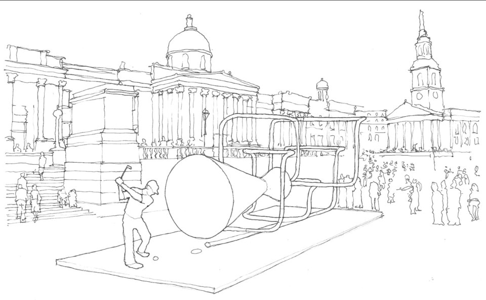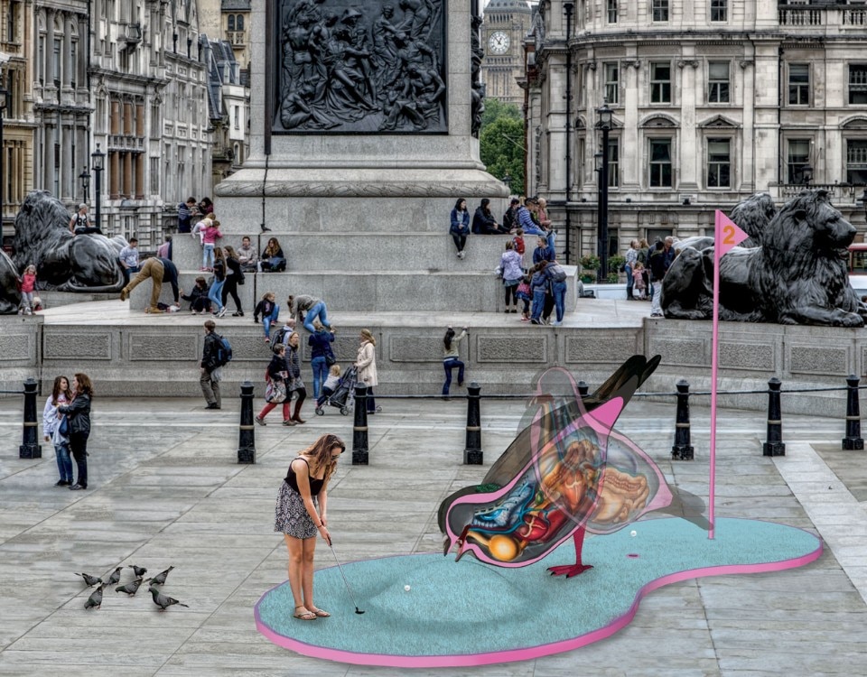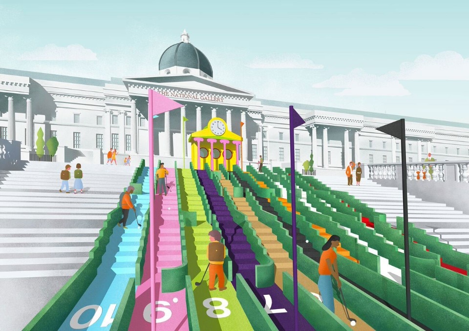 L’obiettivo è racimolare £ 120.000 su Kickstarter per aprire il campo dal 16 al 22 settembre e farne il progetto di punta del London Design Festival 2016, portando nel centro di Londra la consapevolezza possibilità del design. Paul Smith trasformerà le gradinata della National Gallery in un tripudio strisce di diversi colori culminanti in una club-house neo-classica; Zaha Hadid ha progettato un percorso ondulato su due livelli che serpeggiano elegantemente tra i leoni di Trafalgar Square. Tra le altre buche, l’imbuto gigante con tubi pneumatici di Tom Dixon, il labirinto di Mark Wallinger; la rete sorretta da assi di compensato dello studio giapponese Atelier Bow-Wow; e la sezione trasversale di un piccione gigante (attraverso il cui corpo viaggerà la pallina) proposta da Ordinary Architecture.