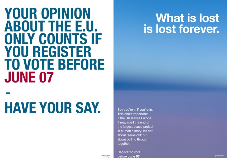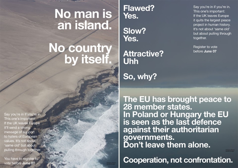 In vista del referendum del 23 giugno, Wolfgang Tillmans, con gli assistenti dei suoi studi di Londra e Berlino e Between Bridges, ha progettato una serie di manifesti per incoraggiare la gente a votare per far sì che il Regno Unito resti all’interno dell’Unione Europea.