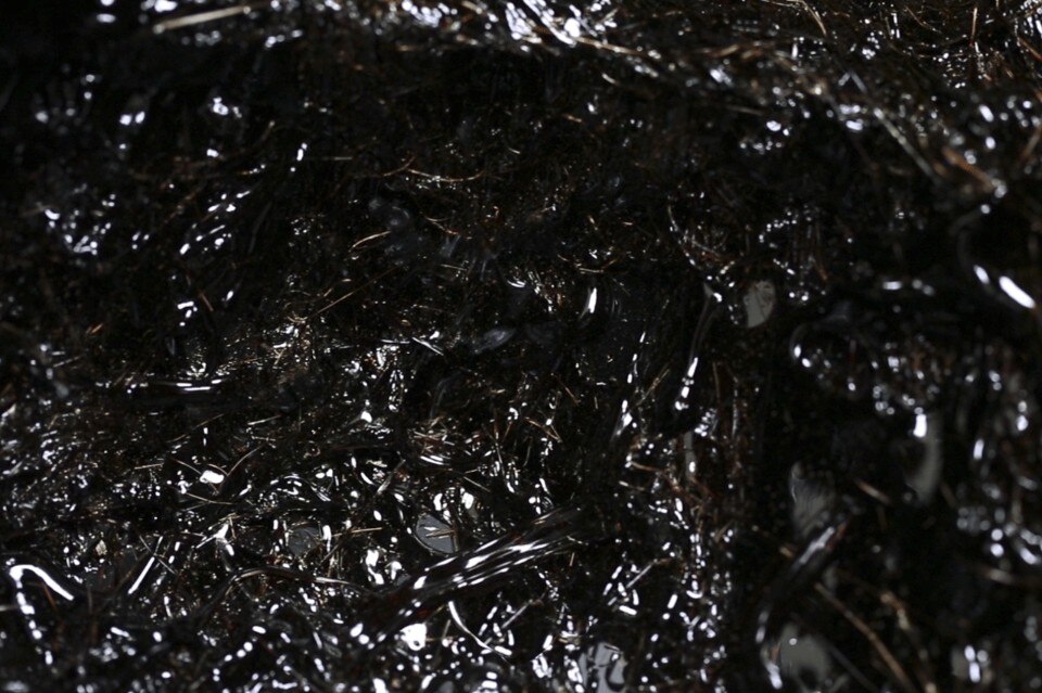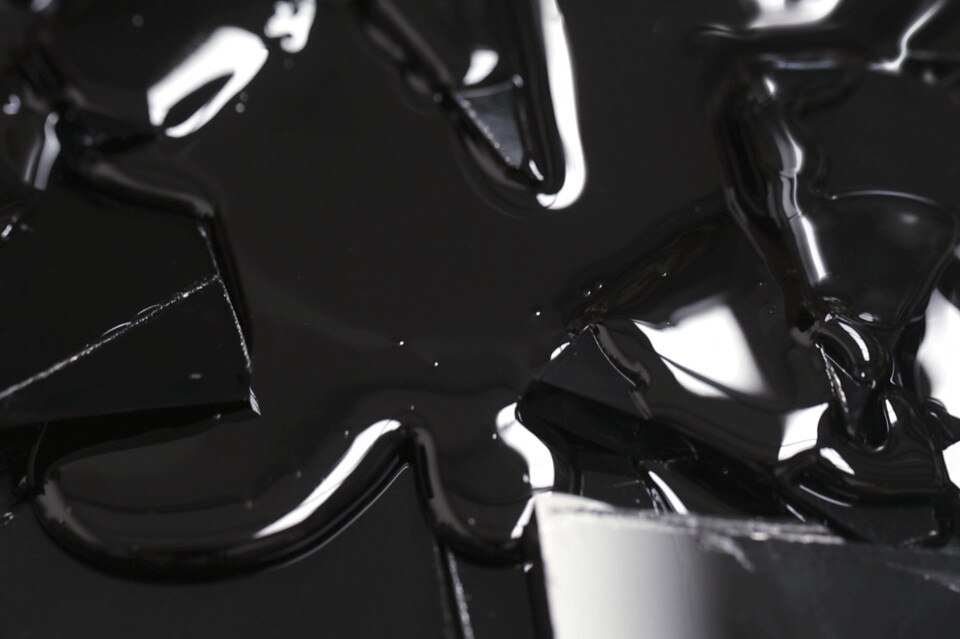 L’aspetto industriale e la percezione della resina d’api portano lo spettatore a chiedersi che cosa sia un materiale naturale e quale possa essere la sua relazione con materiali di scarto industriali. La resina d’api è usata per legare tra loro i pezzi di vetro creando delle sculture quasi aliene.