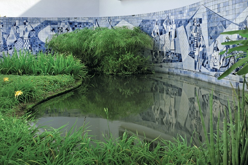 Roberto Burle Marx, giardini della residenza Walter Moreira Salles, ora Instituto Moreira Salles, con i tipici "azulejos" di Burle Marx’s azulejo e le piante intorno a una fontana, 1951. Foto Cesar Barreto