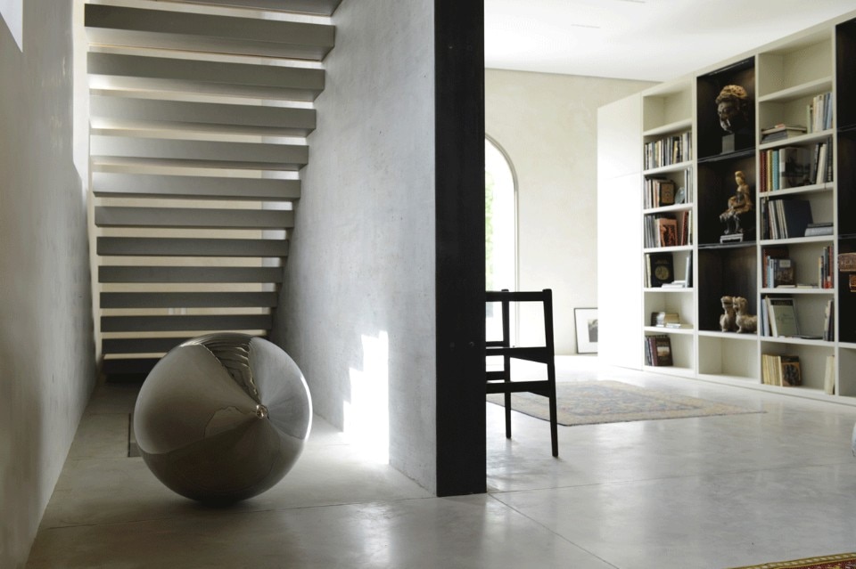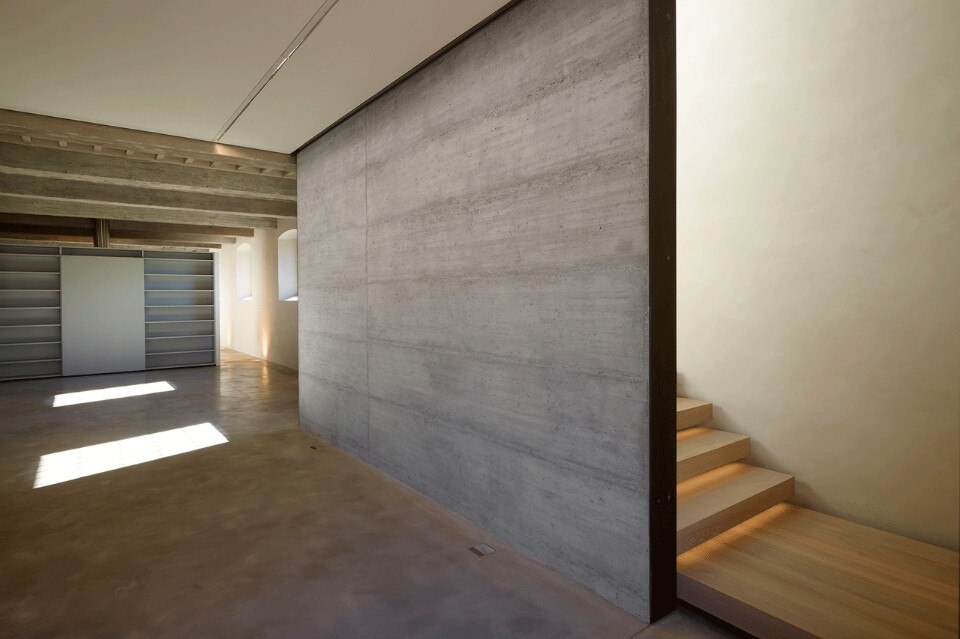 Checchini Chiantelli & Partners, La Capanna, Lucca, 2016. Un setto murario in calcestruzzo sostiene la scala in acciaio e legno che collega i due piani openspace, divenendo elemento costruttivo caratterizzante del progetto