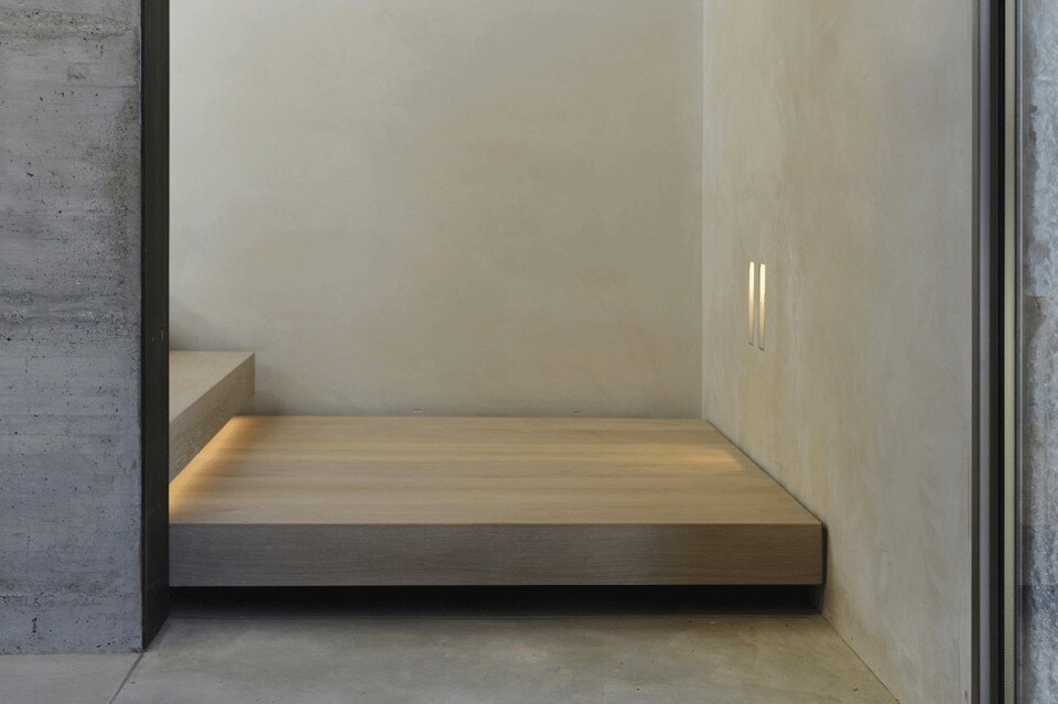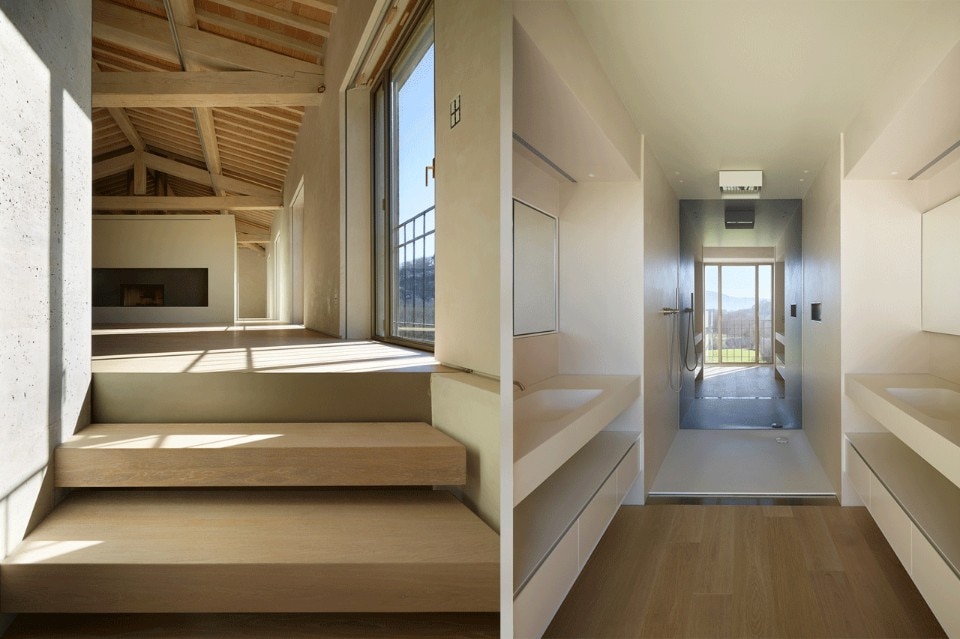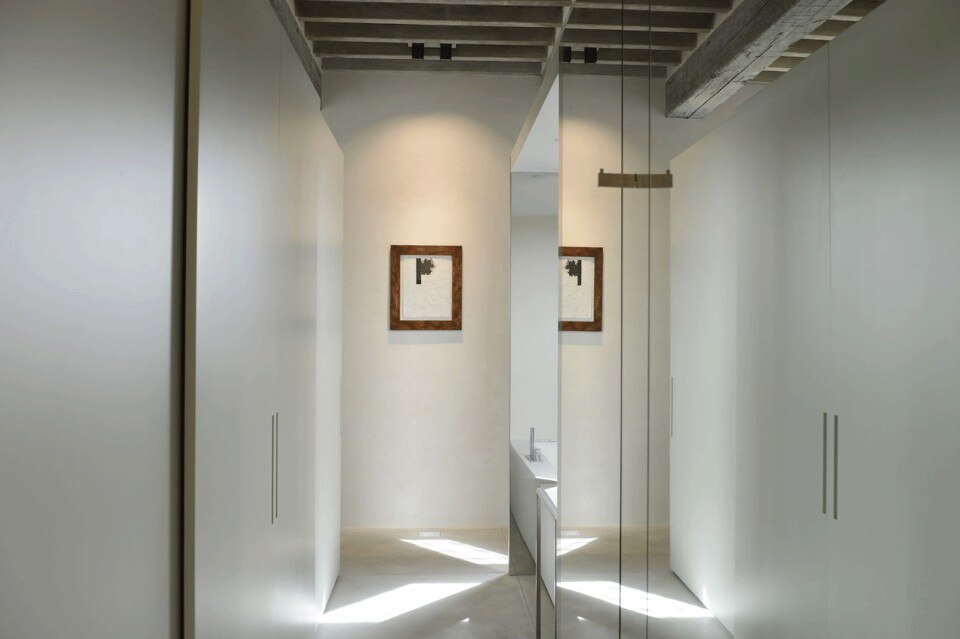 Checchini Chiantelli & Partners, La Capanna, Lucca, 2016. Tutte le strutture lignee sono tonalizzate con velature di colore, per armonizzarle con la finitura a calce delle pareti e dei pavimenti in legno naturale e cemento in getto