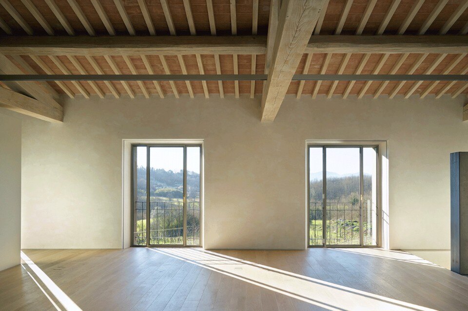 Checchini Chiantelli & Partners, La Capanna, Lucca, 2016. Non potendo intervenire sui prospetti esterni, l’involucro è stato isolato con un cappotto interno di intonaco ecologico naturale ecocompatibile, formulato con calce idraulica, sughero, argilla e polveri diatomeiche, ad alto potere di isolamento termico, fonoassorbente, traspirante e deumidificante