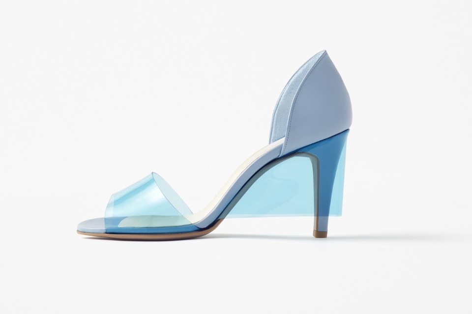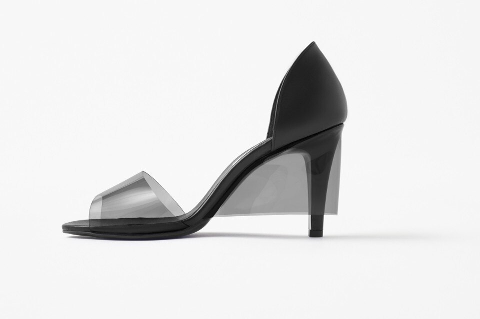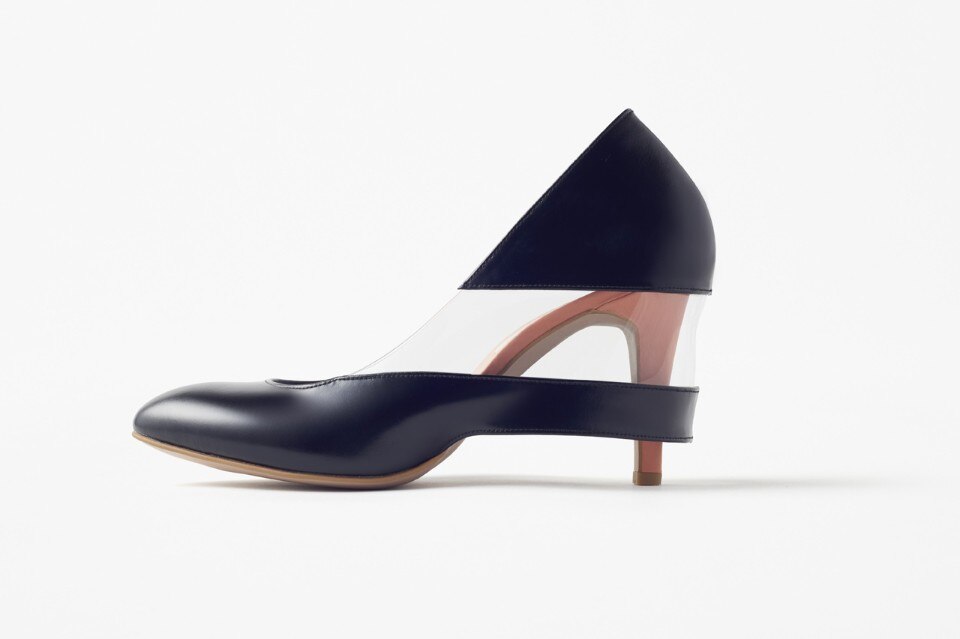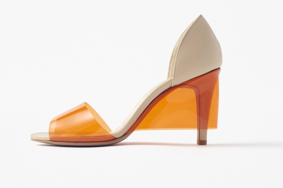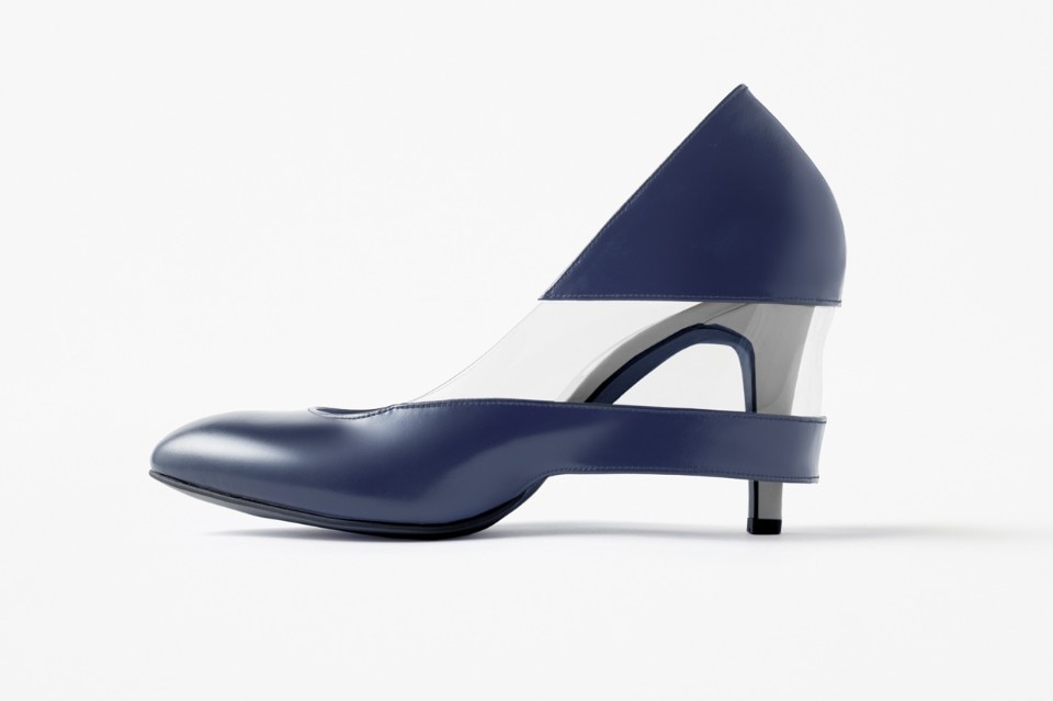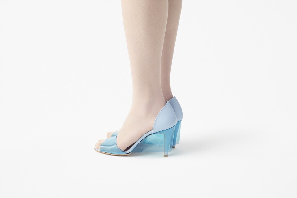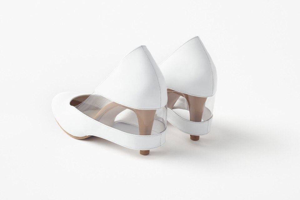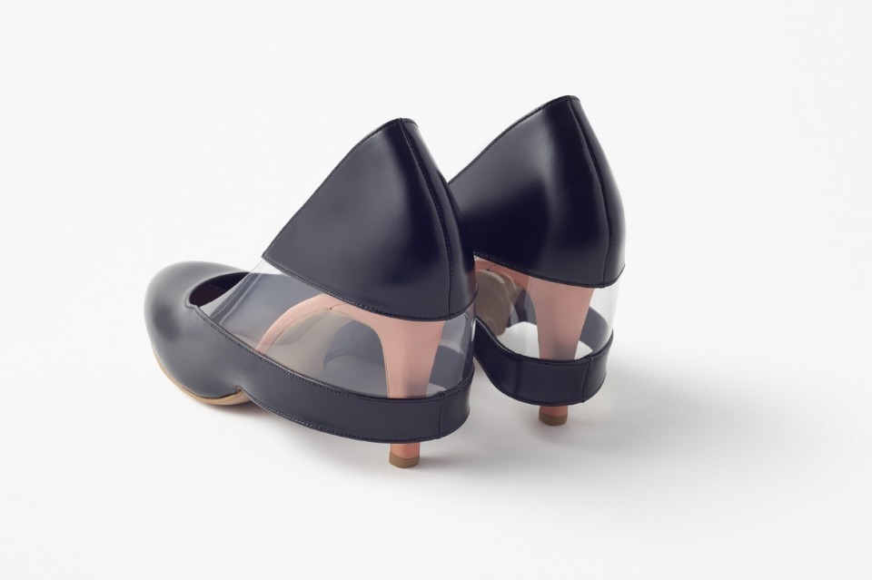 Avvolgendo il tacco con un materiale di rivestimento, sembra che le scarpe indossino una gonnella. Nendo ha proposto tre modelli: un sandalo col tacco, abbinato a PVC trasparente e colorato, un paio di décolleté rivestite in pelle perforata, e un paio che combina pelle lavorata e parti trasparenti per donare maggiore movimento.