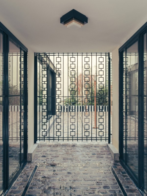 La hall prosegue in un living progettato nello spirito di un bar-club con biblioteca in stile Art Decò, per poi collegarsi a una grande sala caratterizzata da sospensioni in vetro lucido bianco e ottone. La pavimentazione e le pareti grafiche nere e bianche, che ricordano le colonne di Buren nel Palais Royal, creano un’atmosfera decisamente parigina.