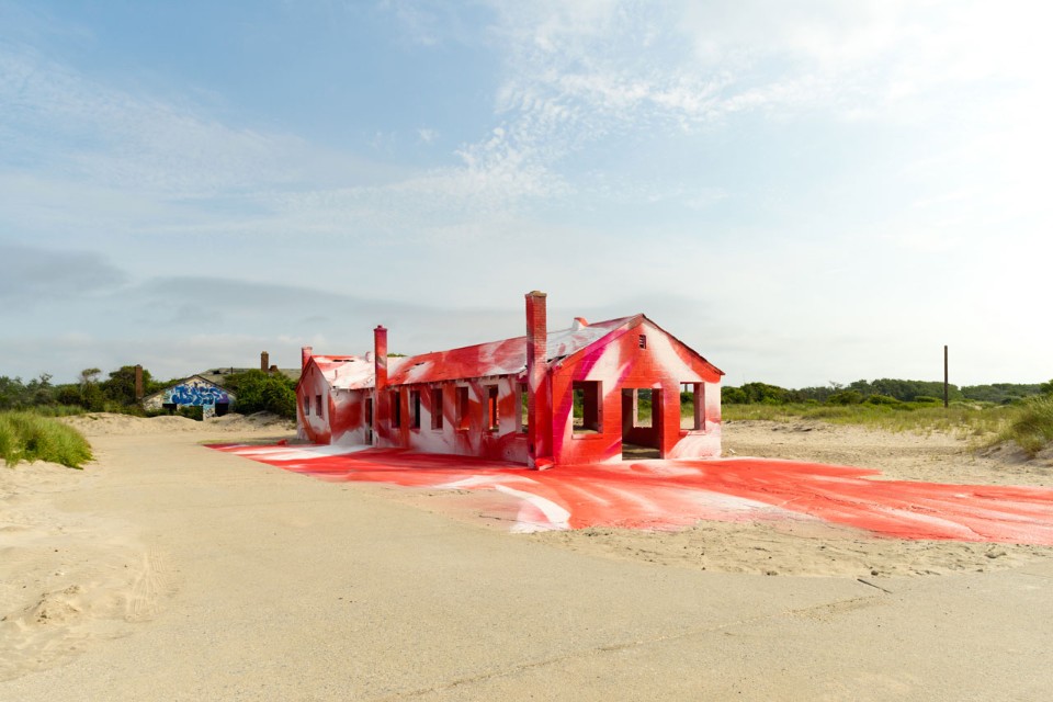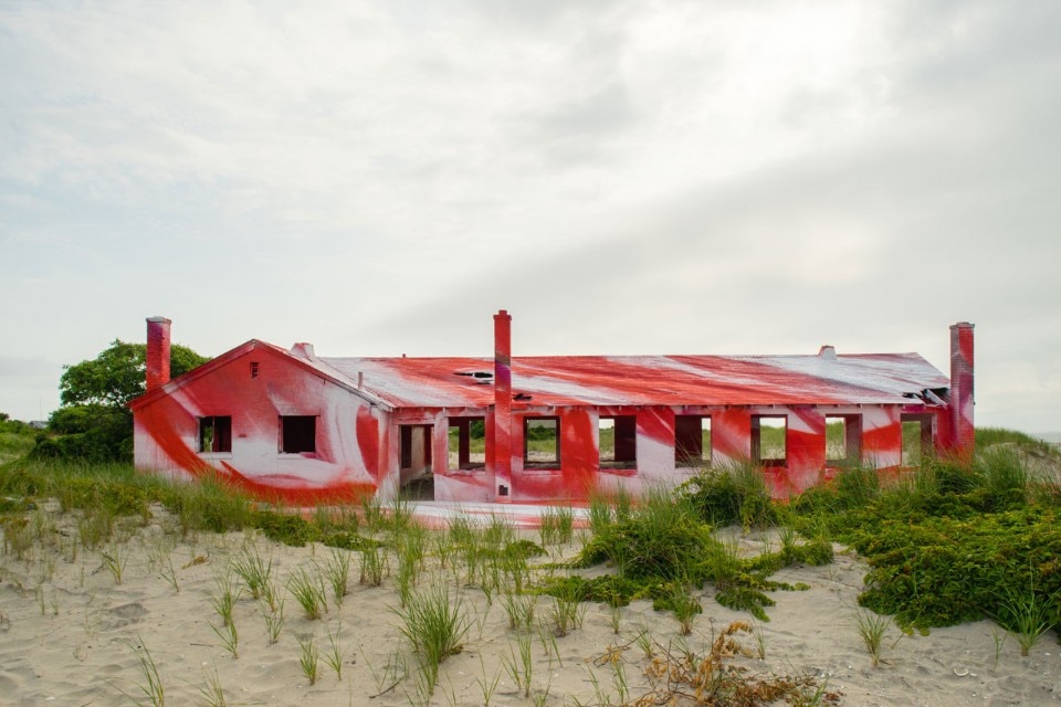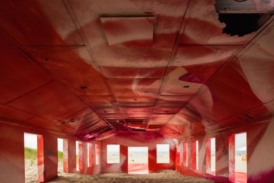 Rispecchiando i colori forti del tramonto di Rockaways, Grosse ha trasformato un decadente edificio sulla spiaggia di Fort Tilden in un’opera d’arte monumentale e sublime, impiegando una particolare tecnica di verniciatura a spruzzo direttamente sulla struttura. L’installazione di Grosse ospiterà una festa finale e commemorativa di questo edificio-simbolo, che è stato reso strutturalmente inservibile dall’uragano Sandy nel 2012 e che è destinato a essere demolito alla fine dell’anno.