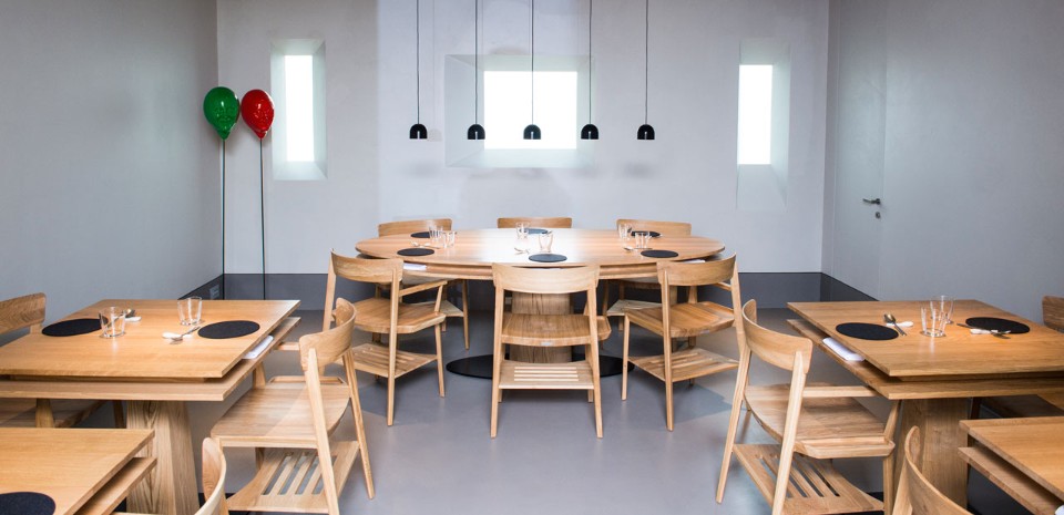 Tutto è stato pensato per offrire un’esperienza che abbatta le barriere tra cucina e sala da pranzo, a cominciare dai tavoli e dalle sedie, disegnate dal cuoco stesso, realizzando concretamente alcune idee che inseguiva da tempo. E cioè la creazione di elementi di arredamento che fossero essenziali, lineari e funzionali. La comodità, a suo parere, si traduce in tranquillità e rilassatezza, ma anche nel favorire – attraverso una forma ergonomica degli arredi nata dall’osservazione quotidiana degli ospiti – una digestione corretta, che comincia quando ci si siede a tavola e non quando ci si alza.