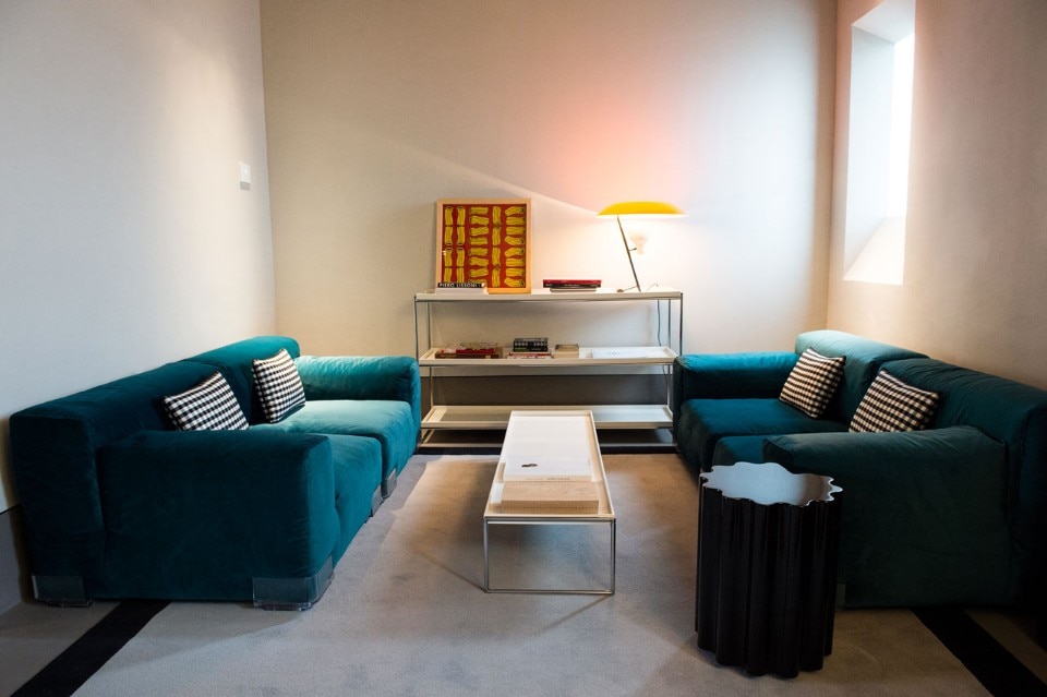 Parte integrante del progetto di architettura, curato da Piero Lissoni, è la vetrata incorniciata da un profilo di metallo traforato e coperta da una pensilina che si affaccia sulla piazza, con una superficie vetrata grande abbastanza da far sì che la piazza possa “entrare in casa” e che la casa possa “entrare nella piazza”.