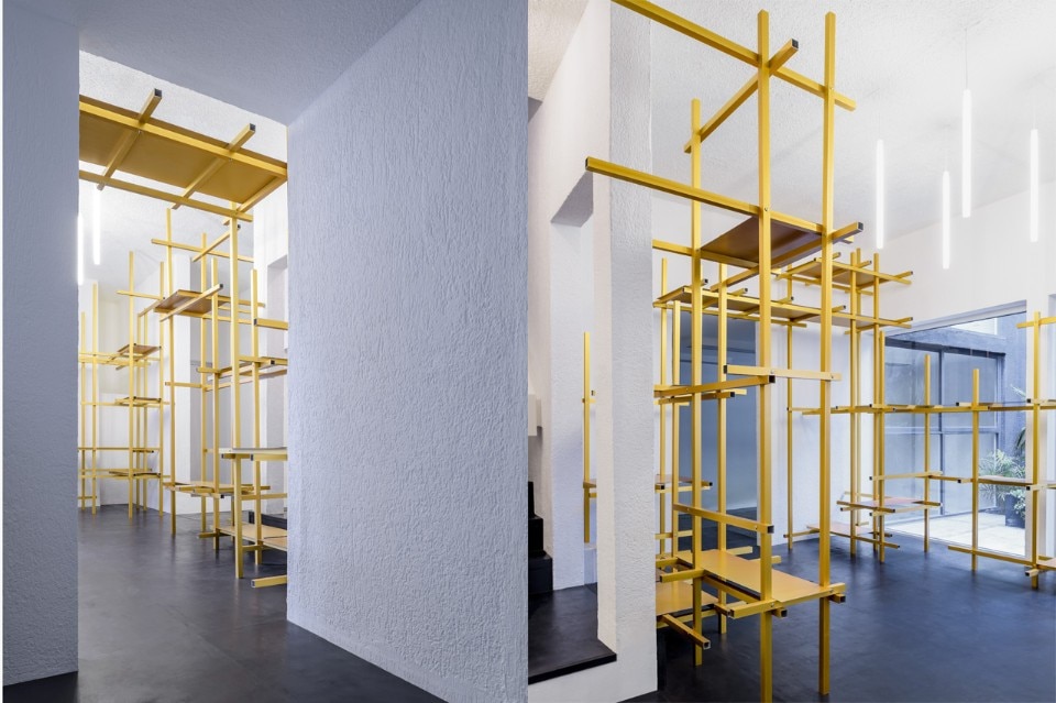 In un’ottica di flessibilità e modularità, la struttura può cambiare forma in base alle esigenze che si presentano di volta in volta. Il pavimento è stato rivestito morbida gomma nera industriale, mentre gli abiti sono stati appesi con grucce dorate realizzate su misura. L’illuminazione dello spazio è data da lampade sospese concepite ad hoc, che con la loro verticalità si inseriscono nella griglia generale.
