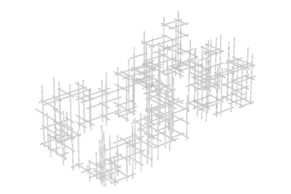 I profilati metallici estrusi si intrecciano collegandosi tra loro in un reticolo ortogonale, creando più livelli di profondità. Il sistema autoportante è fondamentalmente caratterizzato da barre in alluminio anodizzato dorato.