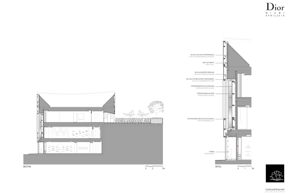 Facciata di BarbaritoBancel Architectes, interni di Dior Architure basati sul concept di Peter Marino. Sezione e dettaglio