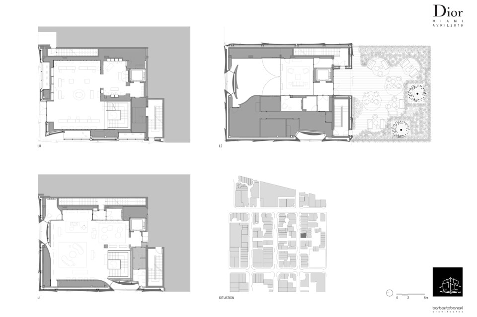 Facciata di BarbaritoBancel Architectes, interni di Dior Architure basati sul concept di Peter Marino. Piante
