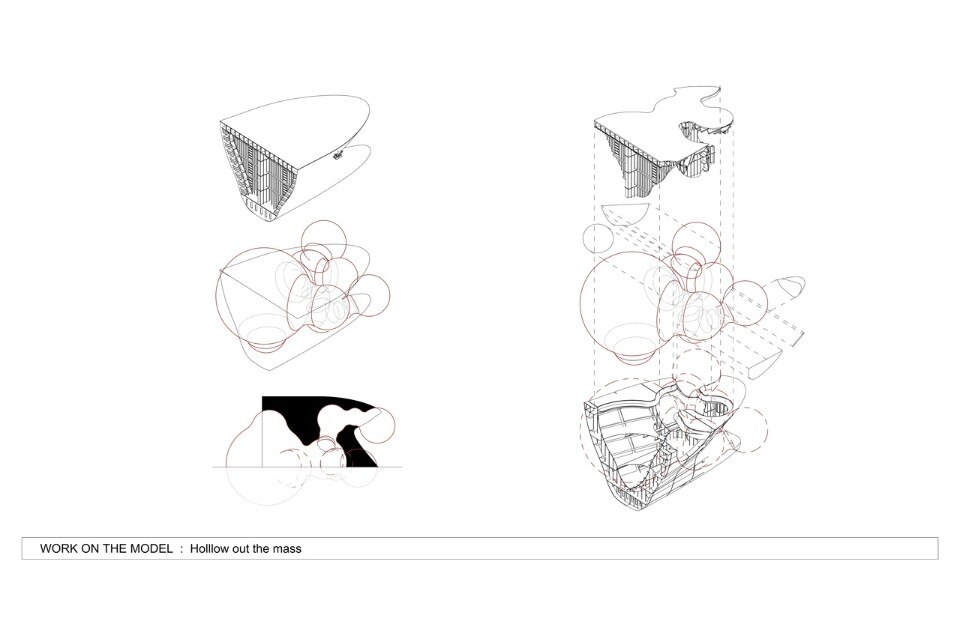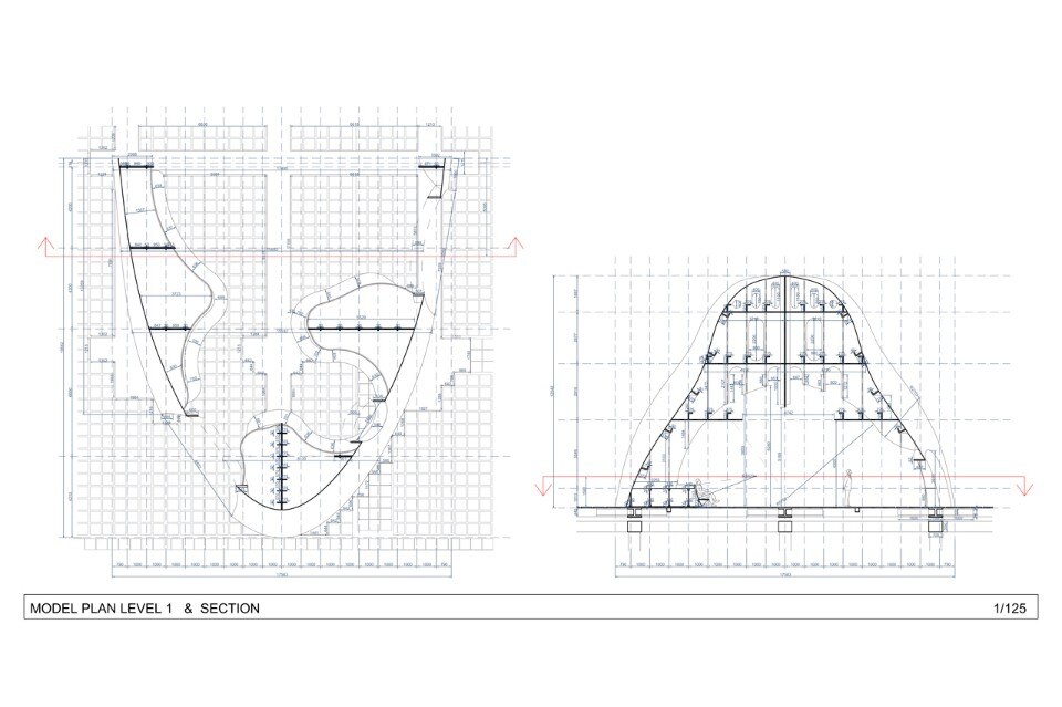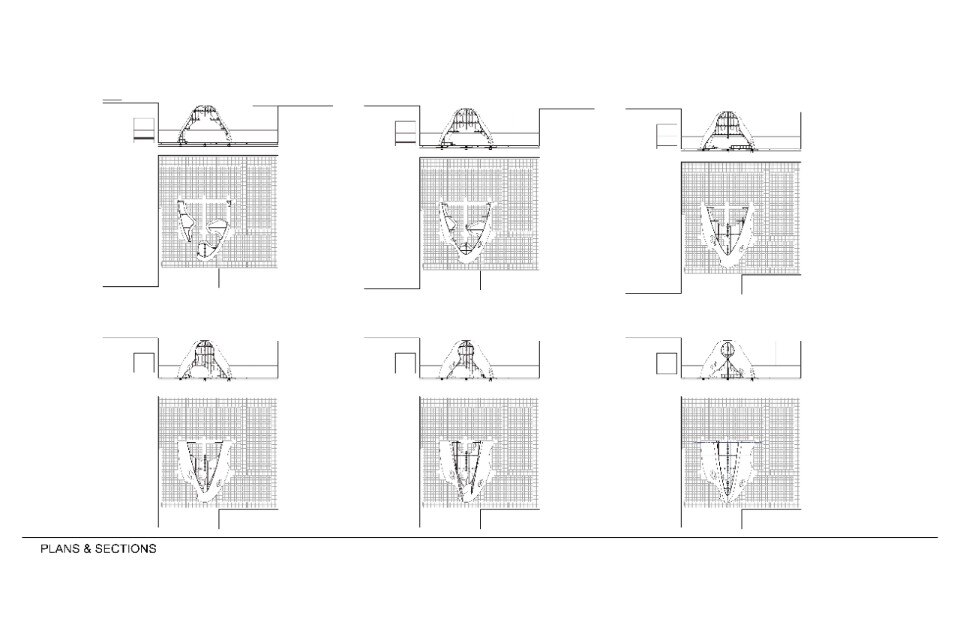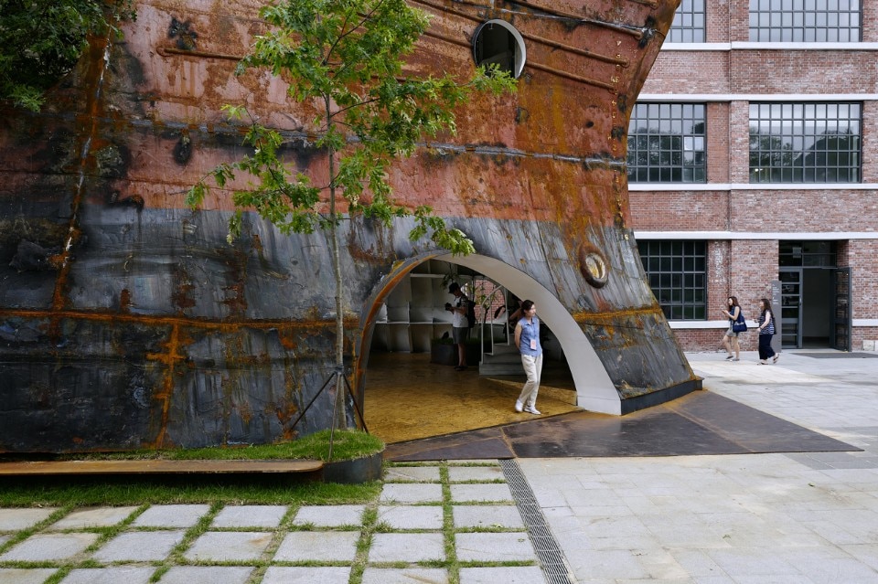 Il padiglione accoglie il visitatore mostrando la sua faccia industriale, fatta di una superficie ruvida e arrugginita e rivelando l’origine del materiale. Lo spazio interno è concepito invece come uno spazio aperto collegato ad un volume più grande, un luogo di riposo circondato da vegetazione. La nave è scavata da sfere collegate che allegeriscono la struttura ma mantengono la forma.