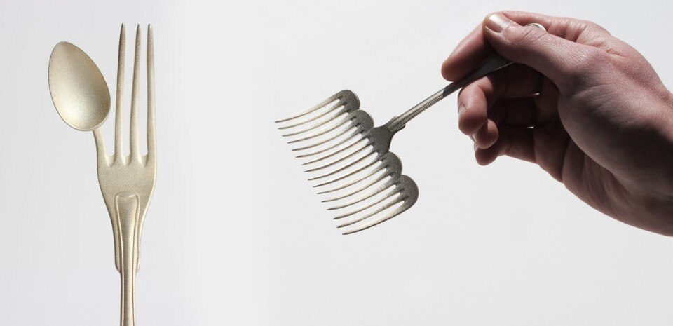In apertura: Maki Okamoto, posate per Steinbeisser, "Experimental Gastronomy", Amsterdam. Sopra: posate di Nils Hint