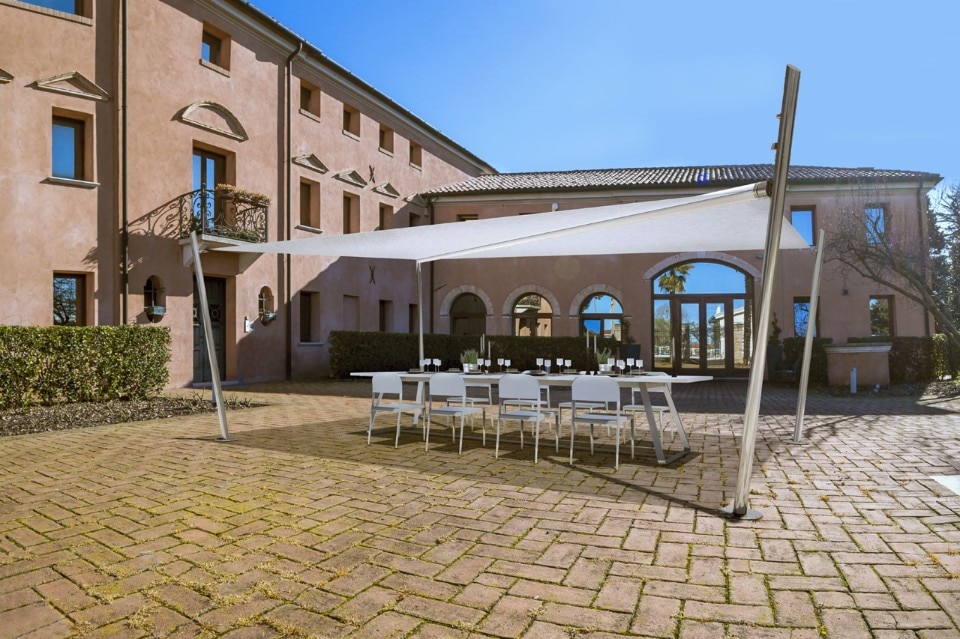 Tra le altre, si distingue Kheope una vera e propria vela ombreggiante di ampie dimensioni che esprime modernità e assicura un’importante zona d’ombra, rappresentando una scelta innovativa per le coperture di domani. L’acciaio della struttura e i materiali della vela fanno sì che la funzionalità sia assoluta e il design leggero, moderno, essenziale.