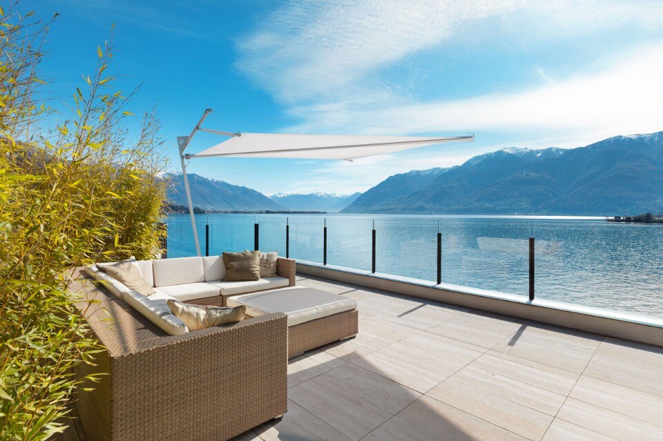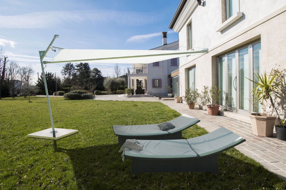 Kheope si configura con una movimentazione motorizzata e l’esclusiva dotazione di anemometro ne assicura la chiusura automatica in caso di forte vento.