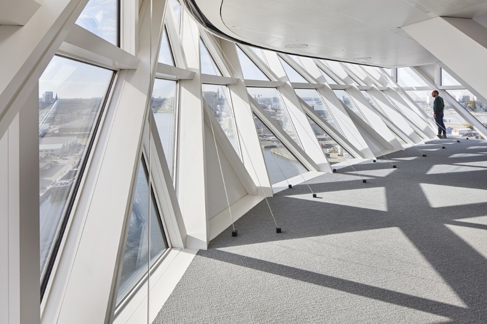 In secondo luogo, grazie alla sua posizione centrale circondata dall’acqua, i quattro prospetti dell’edificio hanno pari importanza, per cui non esiste una facciata principale. L’estensione di ZHA è stata sviluppata in altezza per non nascondere gli edifici esistenti.