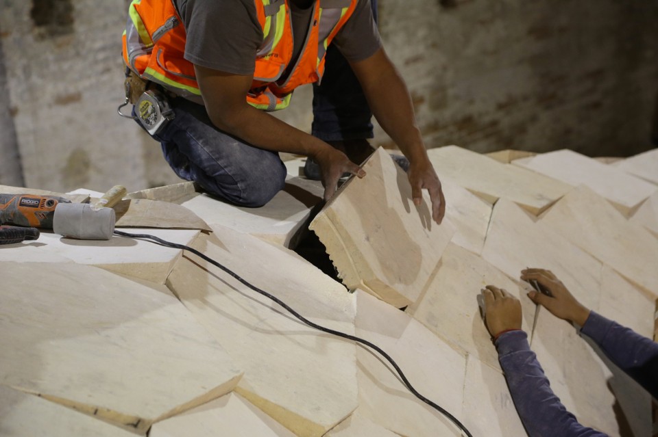 Modellata, fabbricata e realizzata in cinque mesi, la volta è il risultato di dieci anni di ricerca sulle geometrie complesse del BRG che da anni lavora su diversi settori chiave, come l’analisi di strutture e i metodi di progettazione parametrica, l’assemblaggio di elementi discreti, e le tecnologie di fabbricazione digitale