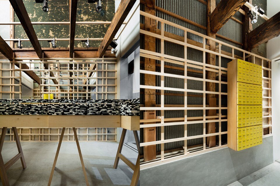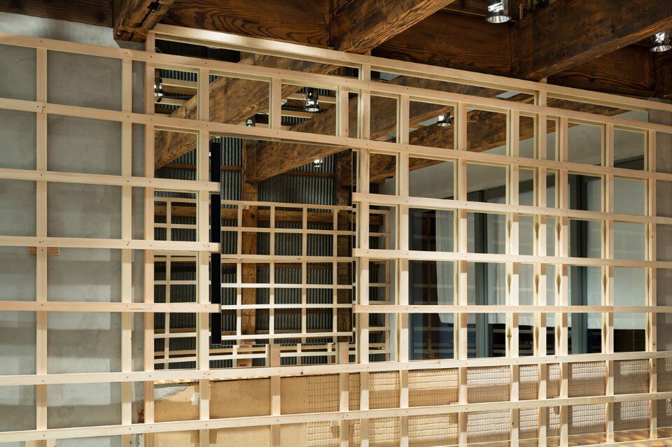 Allo stesso tempo, il reticolato di legno retrostante è stato realizzato con la tecnica “Shitaji-Mado”, tradizionalmente usata nella costruzione delle case da tè giapponesi. La griglia è regolata da specifiche precise regolate dagli artigiani locali, che variano di zona in zona. Lasciate parzialmente esposte, le pareti consentono ai clienti di interagire con la tradizione del luogo e della regione.