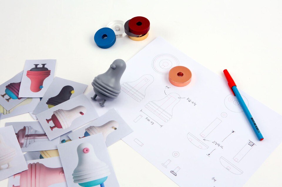 Le forme sono state realizzate con il tornio, studiando l’applicazione di materiali diversi come metallo, legno, pietra e resina. Ogni parte è stata rifinita in modo appropriato a seconda della sua natura.