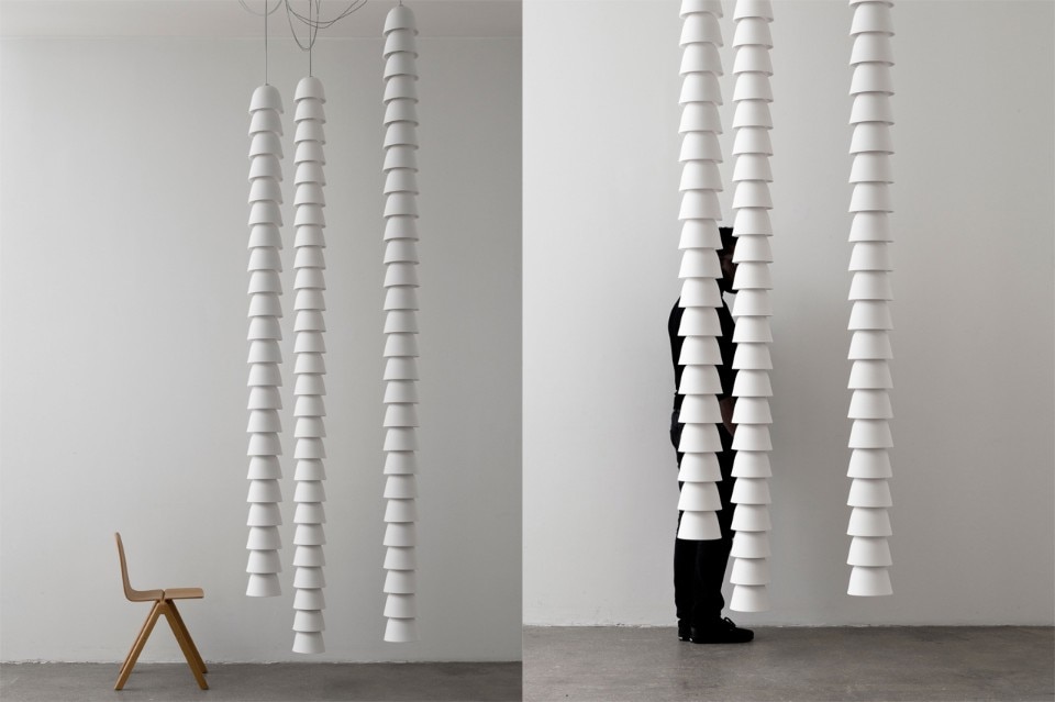 La nuova collezione di lampade di Ronan & Erwan Bouroullec è costituita da catene di piccole campane in gesso, alluminio anodizzato colorato e ceramica.