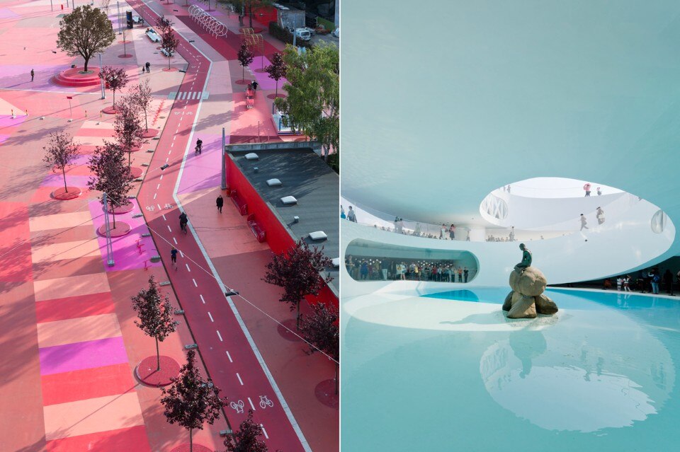 A sinistra: BIG – Bjarke Ingels Group, Superkilen, Copenhagen, 2012. Foto: Iwan Baan. A destra: BIG – Bjarke Ingels Group, Padiglione Danese, World Expo Shanghai, 2010. Foto: Iwan Baan