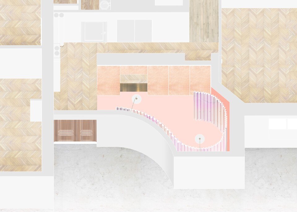 Una grande tenda di oltre sei metri di lunghezza elimina angoli e spigoli della stanza, dando “morbidezza” allo spazio. Al tessuto è stato applicato un trattamento olografico, generando un’atmosfera particolare, con diverse sfumature a seconda del punto di vista.