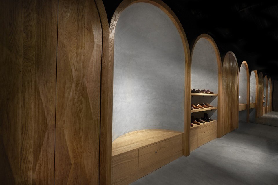 Il negozio offre sia calzature su misura sia modelli già pronti. Situato nel quartiere del Barcode di Oslo, lo spazio di 20 metri quadrati è composto da cinque nicchie in cemento con massicce porte di legno intagliato. Le nicchie, con la particolare forma a volta ospitano ciascuna una funzione: l’armadietto personale del calzolaio con i suoi strumenti e materiali, uno spazio per sedersi, un display, e due nicchie adibite a stoccaggio.