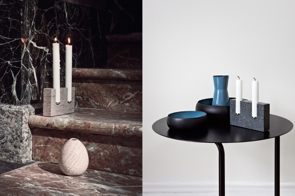 La designer svedese Sanna Völker ha creato una serie di portacandele e vasi in pietra grezza che sembrano intrappolare gli oggetti nella materia.