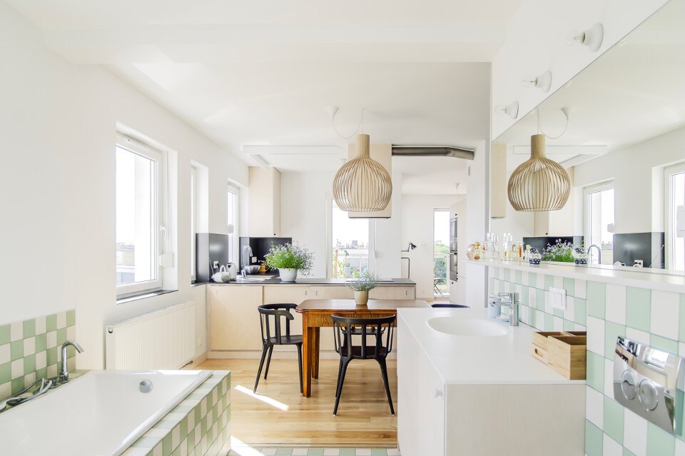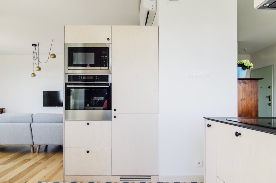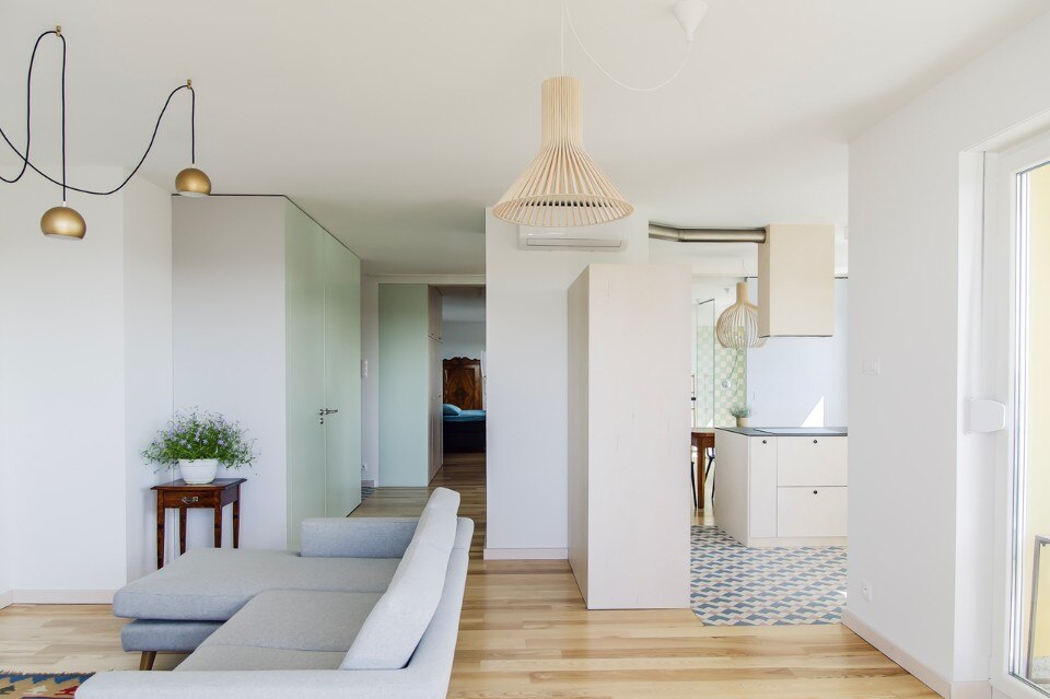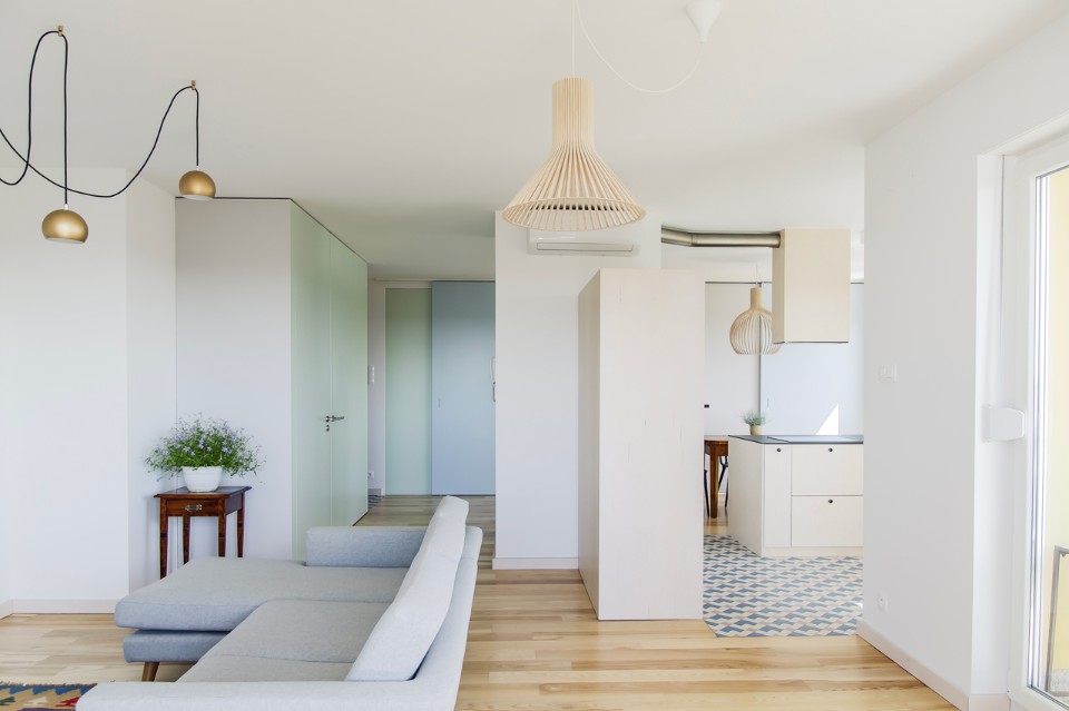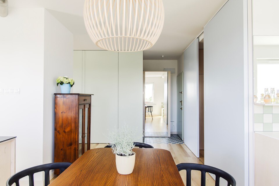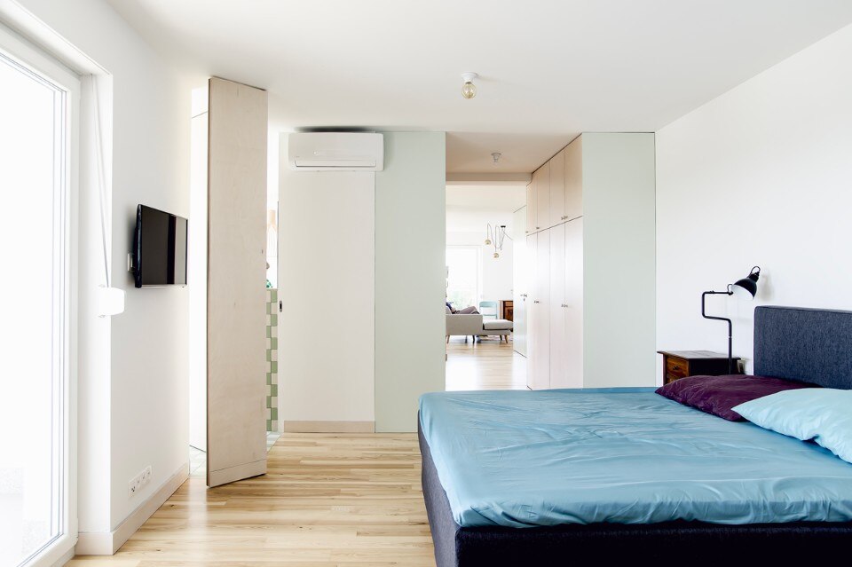 La prima comprende una camera da letto, un bagno e un armadio, mentre la seconda accoglie un soggiorno, una cucina, la sala da pranzo e una zona d’ingresso con bagno e ripostiglio. La presenza di pareti mobili costituite da porte scorrevoli consente all’utente di riconfigurare gli spazi a piacimento, da ‘privati’ a ‘pubblici’ a seconda delle esigenze.