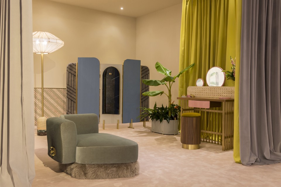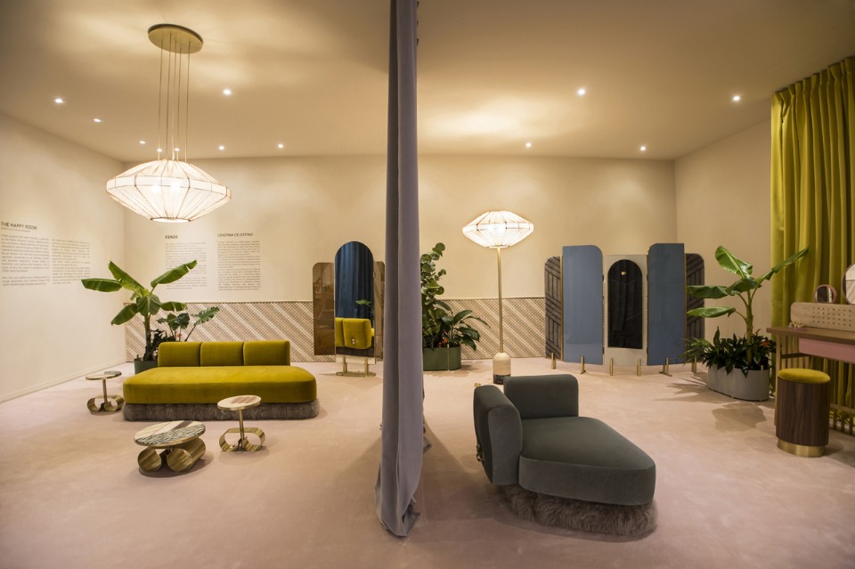 Contraddistinto da volumi semplici, forme arrotondate, e un chiaro cromatismo legato al design italiano degli anni 50, lo spazio suggerisce femminilità grazie ad elementi quali il mosaico Plumage a parete che incornicia la stanza, e a diversi richiami dell’iconografia di Fendi, tra cui l’arco del Palazzo della Civiltà Italiana di Roma, presente a parete e negli intarsi in marmo dei tavolini.