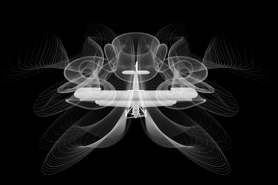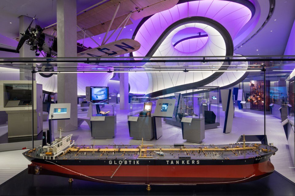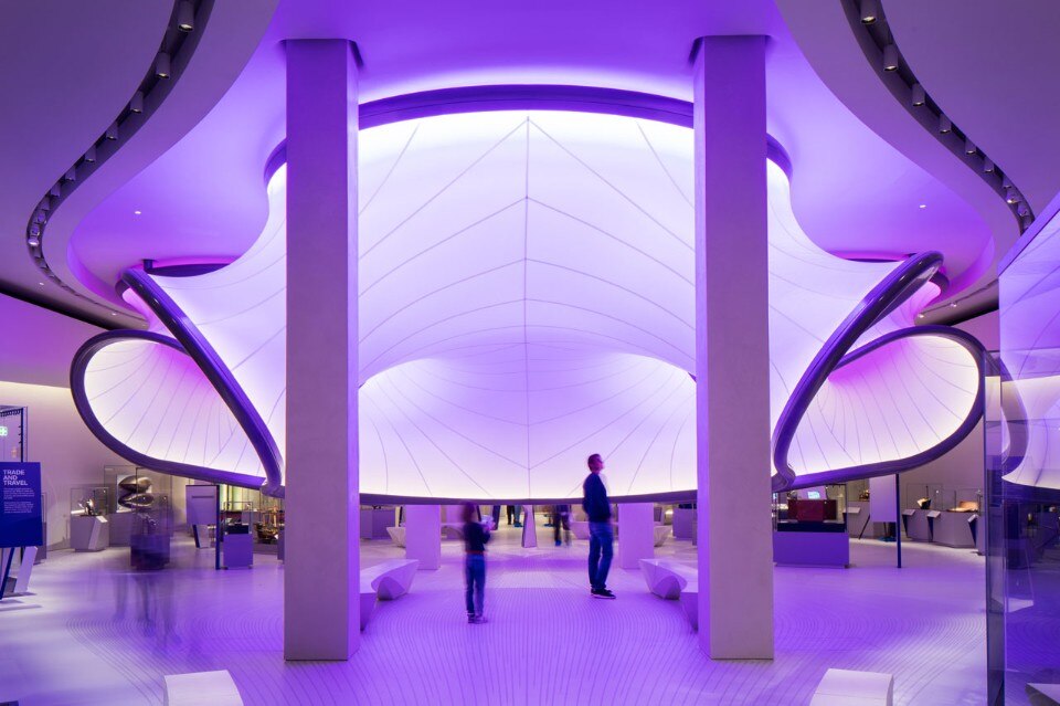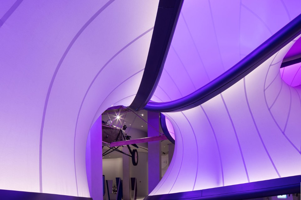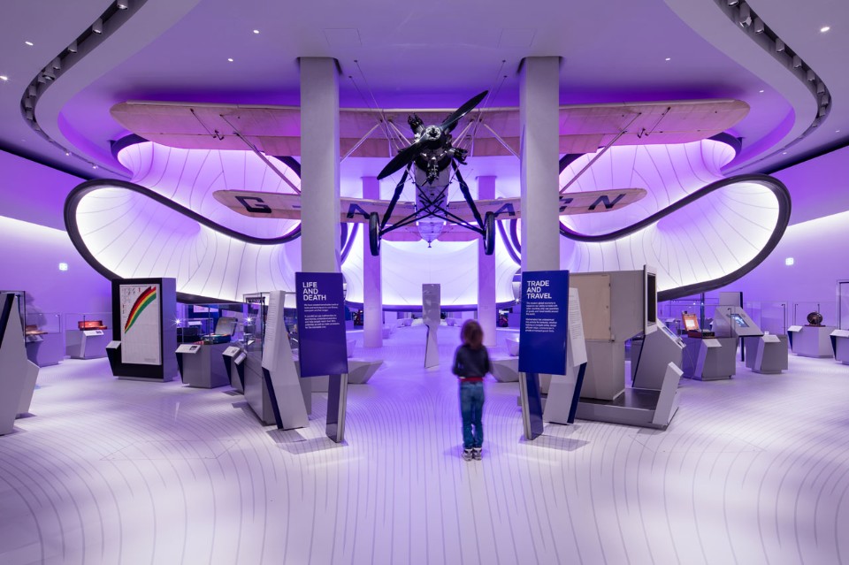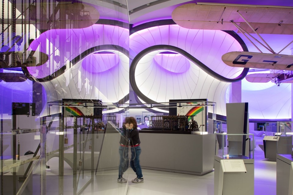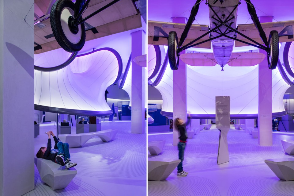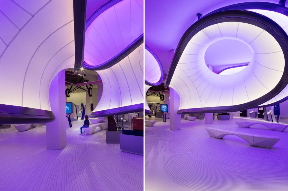 Al centro della galleria è posizionato l’aereo Handley Page “Gugnunc”, costruito nel 1929 in occasione di un concorso per la costruzione di un velivolo sicuro. Ispirato al velivolo, il progetto della Galleria è guidato dalle equazioni del flusso dell’aria utilizzate nel settore del trasporto aereo. La disposizione e le linee della galleria rappresentano l’aria che scorreva attorno questo velivolo storico quando si trovava in volo, determinando la posizione delle vetrine e delle panchine e le superfici curve tridimensionali della struttura centrale.