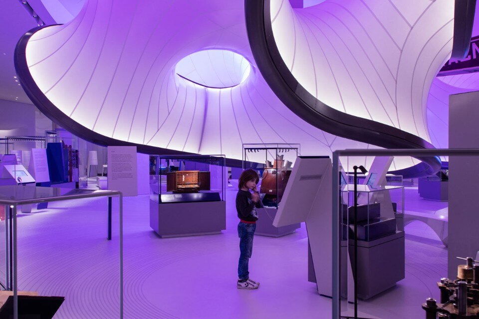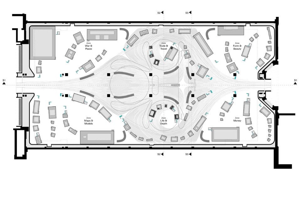 Il layout della Galleria consente alle linee virtuali del flusso dell’aria di manifestarsi fisicamente. Il posizionamento degli oltre 100 oggetti storici, e la produzione di robuste panche ad arco, così come l’utilizzo di una linea di produzione robotizzata, incarnano tutti lo spirito matematico del brief iniziale. L’esperienza spaziale che ne risulta è il risultato di questi elementi che permettono ai visitatori di visualizzare e percepire i molti modi in cui la matematica tocca la nostra vita.