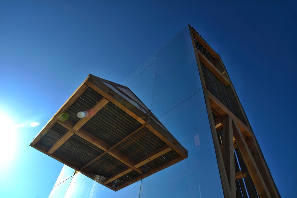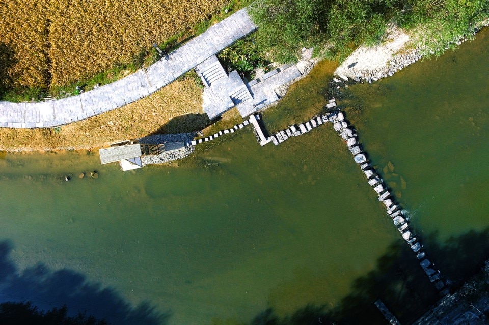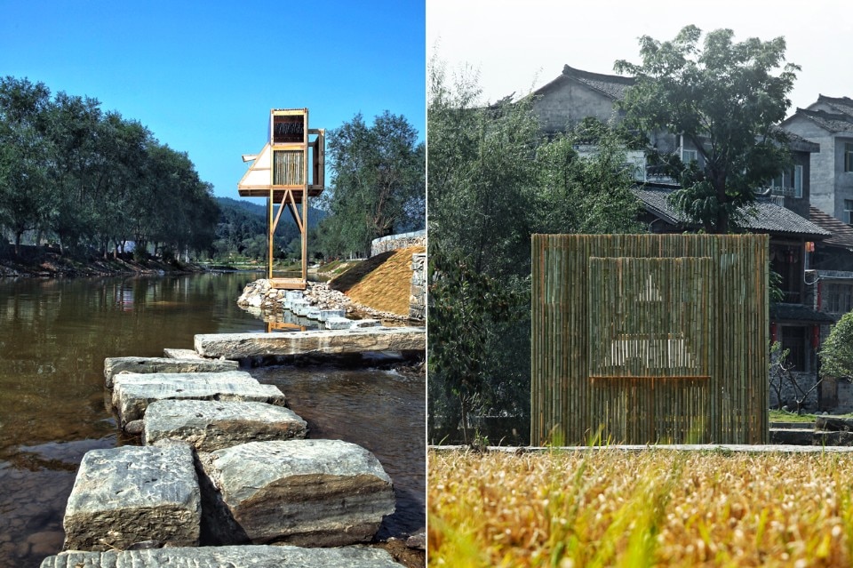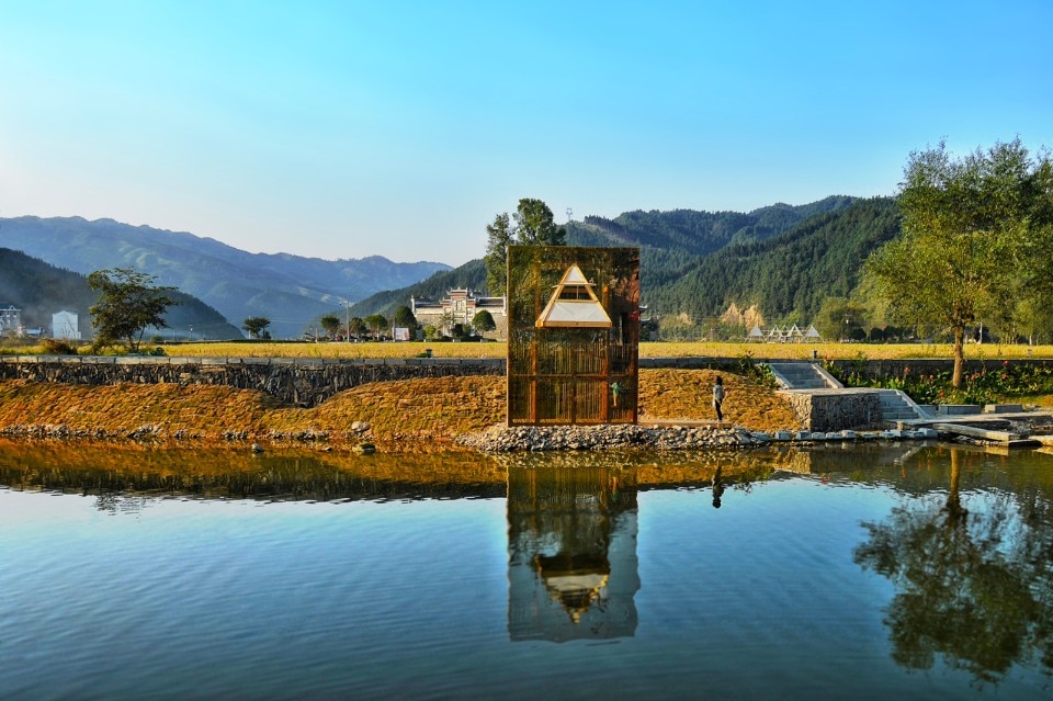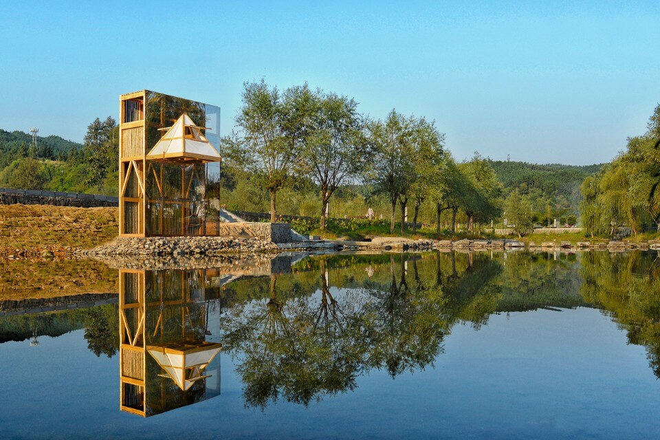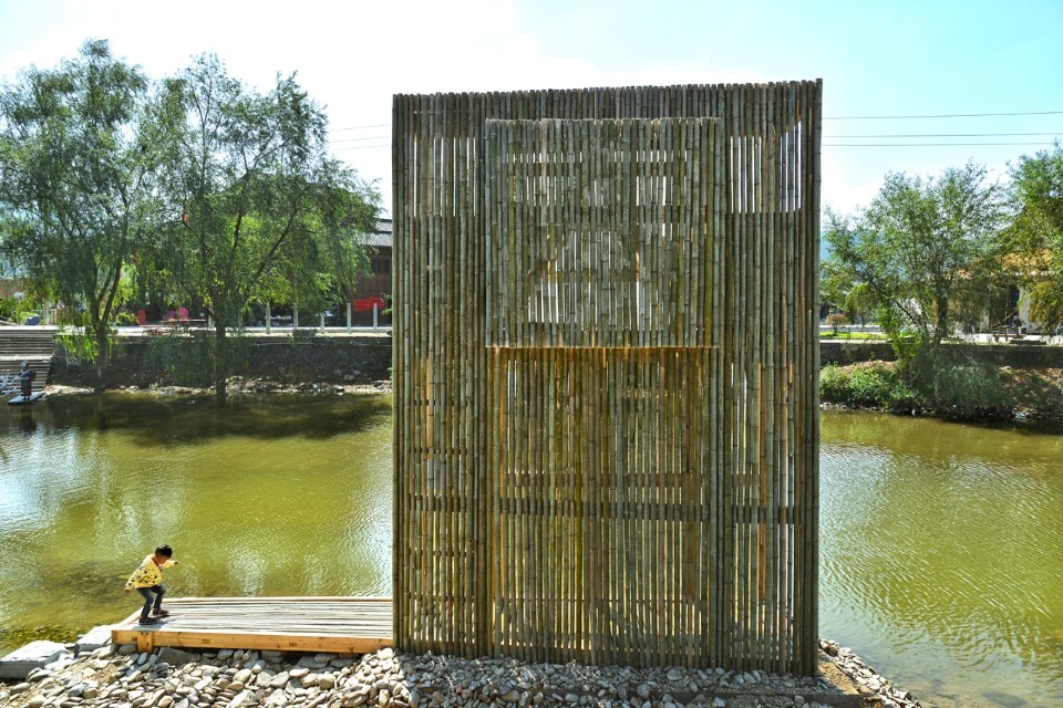 Il padiglione è distribuito su due piani: al piano superiore le persone possono godere del panorama rurale e a quello inferiore posso sostare e riposare. Gli architetti hanno usato materiali molto diversi tra loro per differenziare le facciate nord e sud. Quella settentrionale è ricoperta di legno e bambù locali, mentre quella esposta a nord è rivestita con un vetro specchiante e riflette il fiume Longxi.