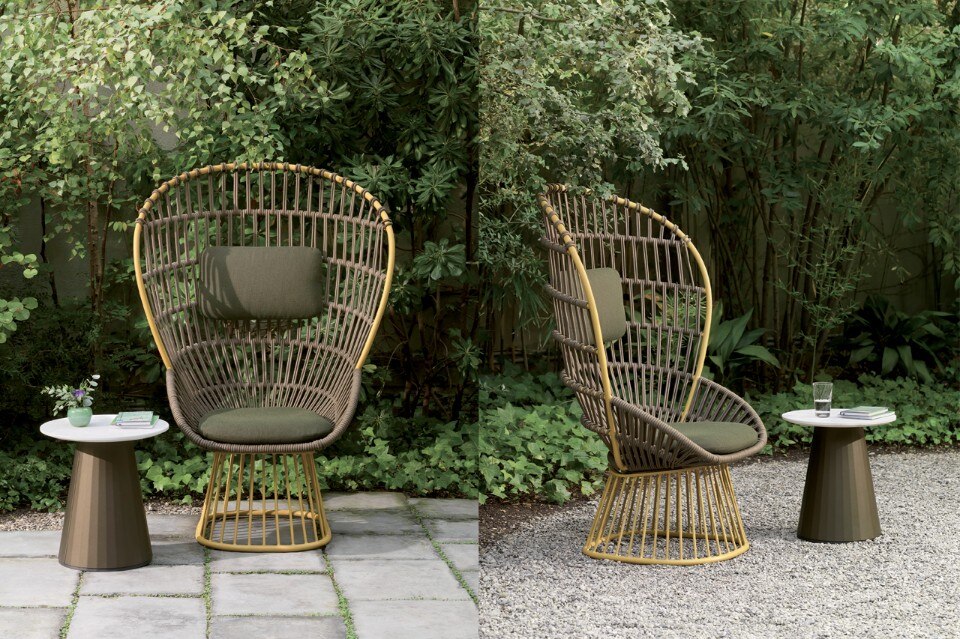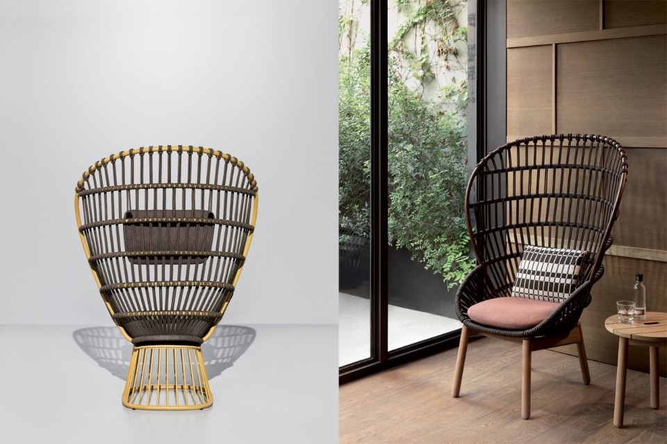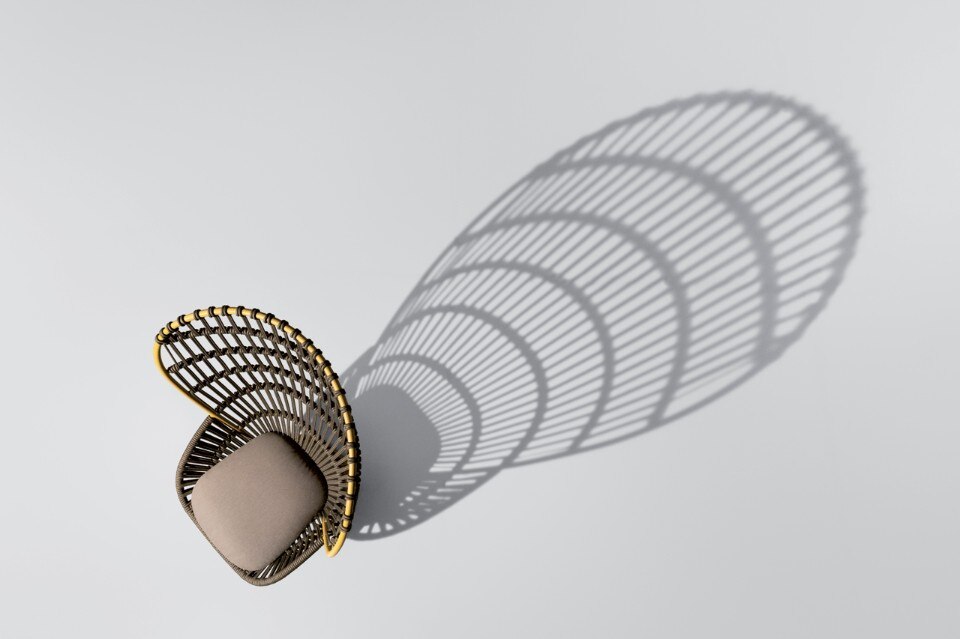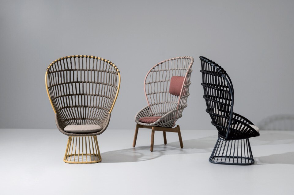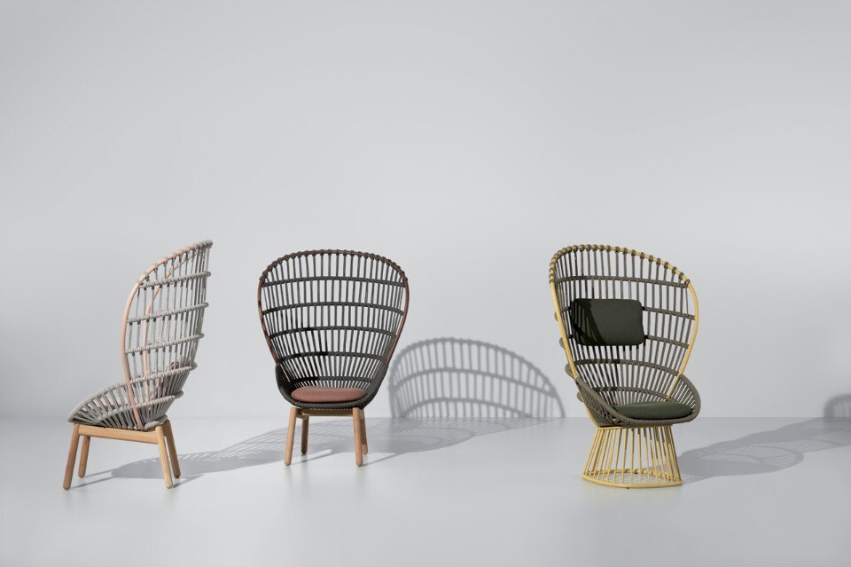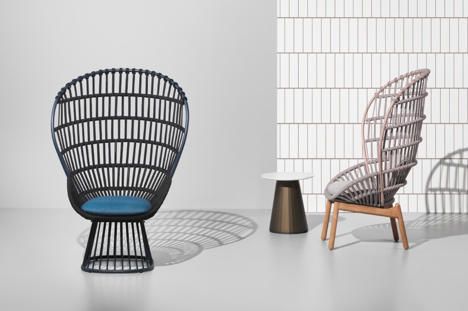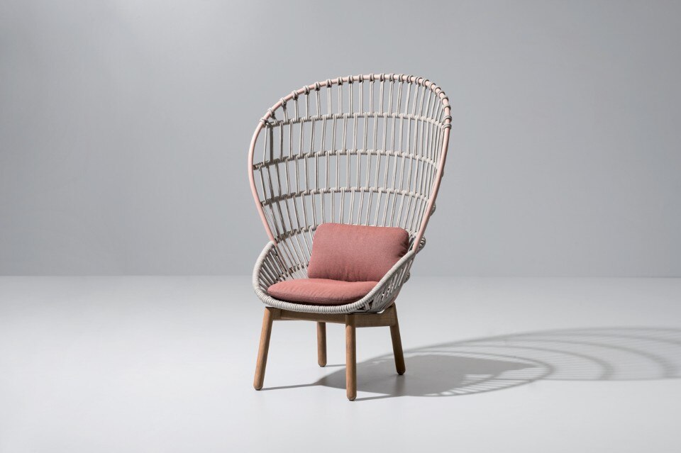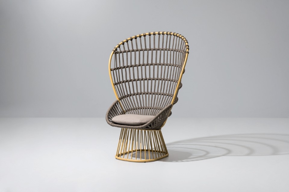 L’intreccio aperto della corda crea una superficie reticolata che offre privacy e allo stesso tempo un collegamento con gli elementi naturali. Cala può essere usata sia come poltroncina da pranzo sia per il relax. La vasta scelta di rivestimenti metallici, di colori per le corde e di stoffe per i cuscini offre la possibilità di adattarla a interni diversi. La struttura è in alluminio rivestito mentre la corda è lavorata a maglia. Cala è disponibile in due versioni: con gambe in teak o con la base del piedistallo in alluminio.