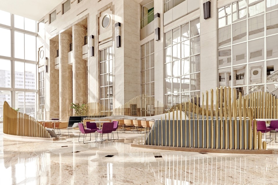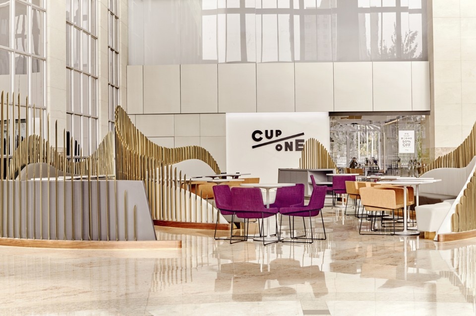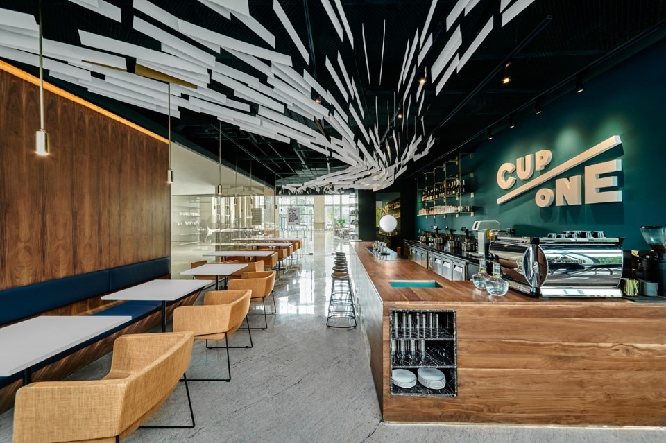 Il CupOne Café si estende da un angolo della lobby fino a una terrazza all’aperto, con un’area coperta che collega entrambi gli spazi. Il progetto di interni si ispira al tema “montagne e fiumi”, tradotto con pezzi su misura autoportanti che ridistribuiscono il café in diverse aree.