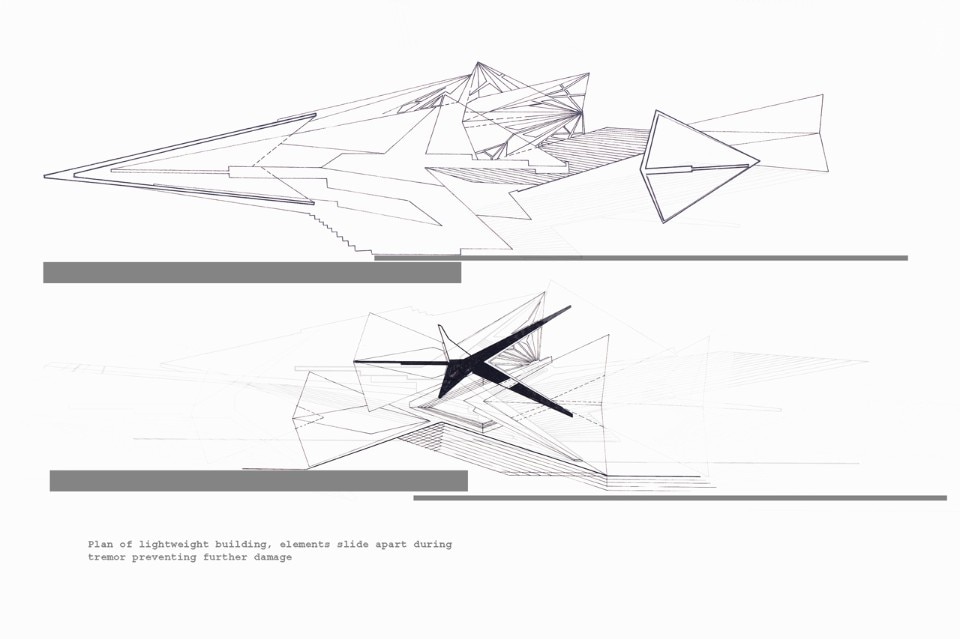 L’intero sistema si basa su una serie di cornici a parallelogramma, che funzionano da ammortizzatori alle scosse sismiche. L’architettura è coreografata dal terremoto, rispondendo al movimento e minimizzando l’impatto dell’energia cinetica. Il software utilizzato per sviluppare il progetto riesce a simulare il sisma e comprendere gli effetti sull’edificio.