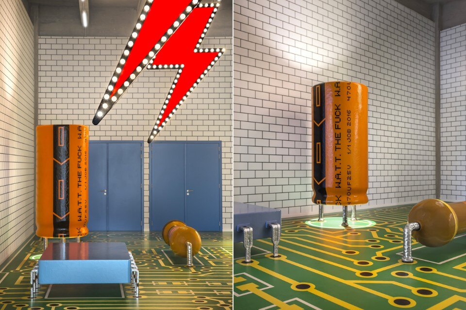 Serge Hannecart – produttore cinematografico, collezionista d’arte e committente del progetto – ha trasformato l’edificio modernista in un centro contemporaneo per uffici. Studio Job ha “elettrizzato” l’atrio principale della torre, realizzando una colorata installazione.