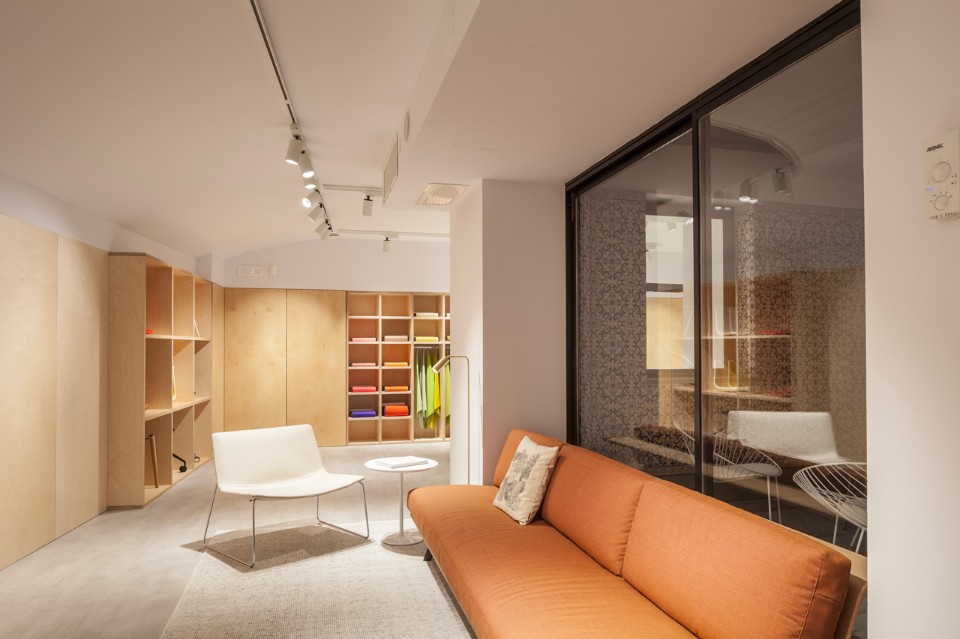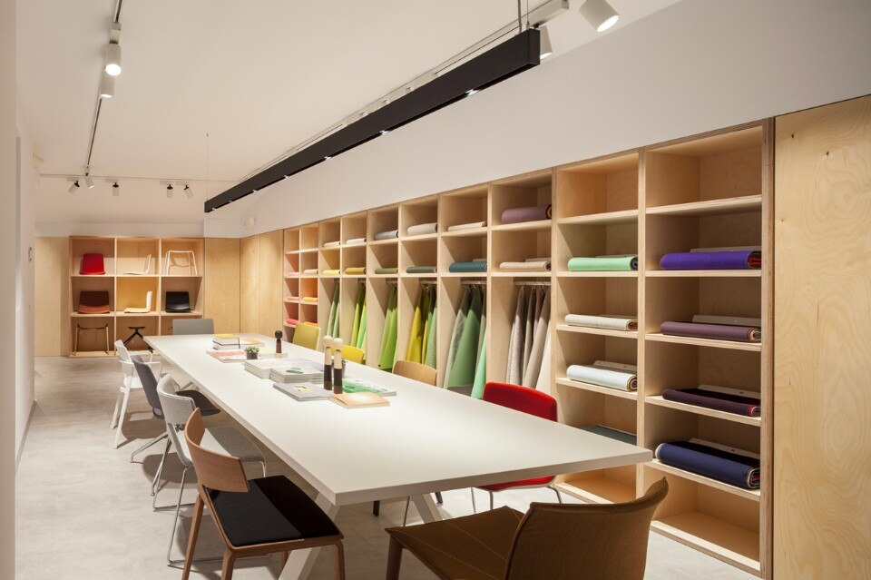 Un forte elemento architettonico è stato completamente riprogettato: la scala, dalla forma elicoidale, ampia e armoniosa, appare ora come un unico blocco di legno che invita al piano interrato, dove ospitare i progettisti e assisterli nelle fasi di decisione e personalizzazione dei progetti per il contract. Il rinnovato spazio di Milano è stato infatti concepito prima di tutto come spazio dedicato alla progettazione. Qui ha luogo la materioteca: tessuti, finiture e colori sono a disposizione dell’architetto in un’atmosfera accogliente, che esprime appieno il brand e le sue potenzialità.