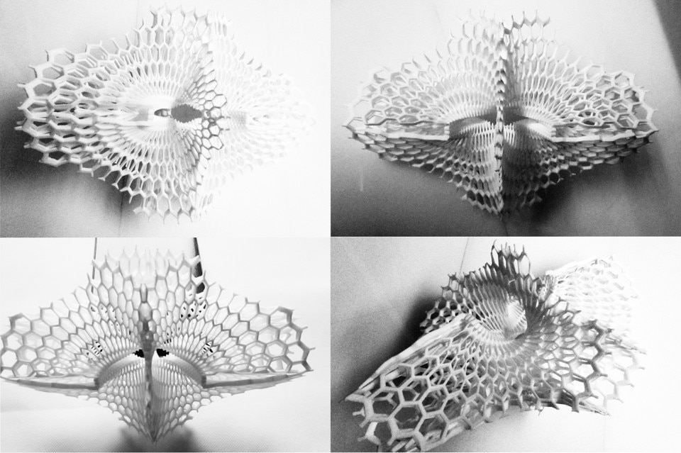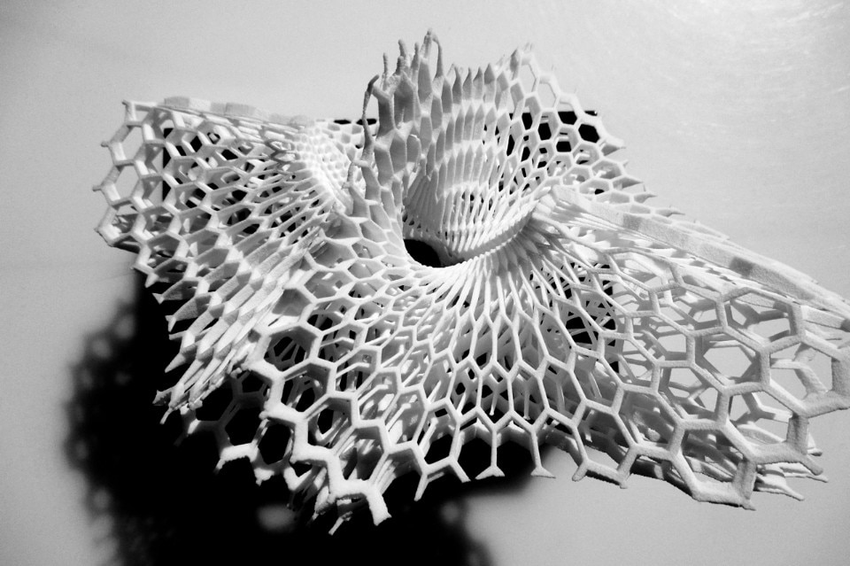 Il progetto è un esempio di invarianza di scala. Le forme complesse dirigono la luce del LED su tutto il modello, che diffonde, devia e rifrange la luce. La forma è antitetica quella seriale dei prodotti da cui proviene, come le bottiglie di plastica, poi riciclate. Il modello progettato con software parametrici è disponibile in un’infinità di configurazioni stampabili in 3D.