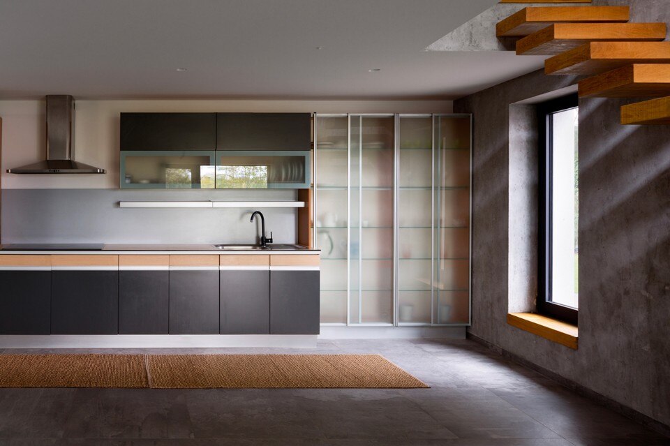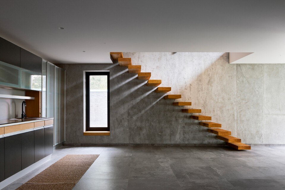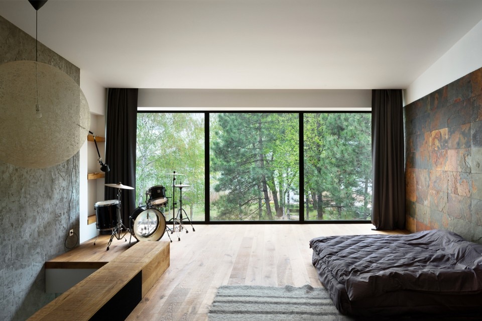 La piscina all’aperto e un piccolo cortile con un pontile di legno vicino al fiume uniscono le due case. Lo spazio aperto comune svolge un importante ruolo nella vita familiare. Entrambe le case sono connesse a un unico sistema di domotica. Le aperture panoramiche creano un importante rapporto tra il paesaggio naturale e l’abitazione.