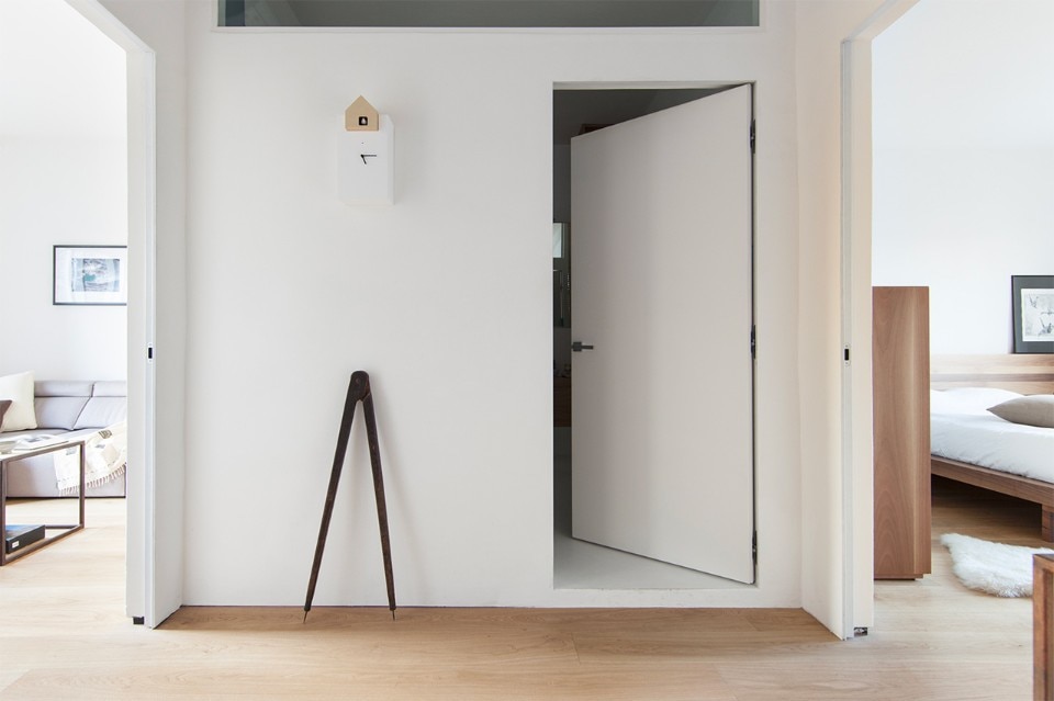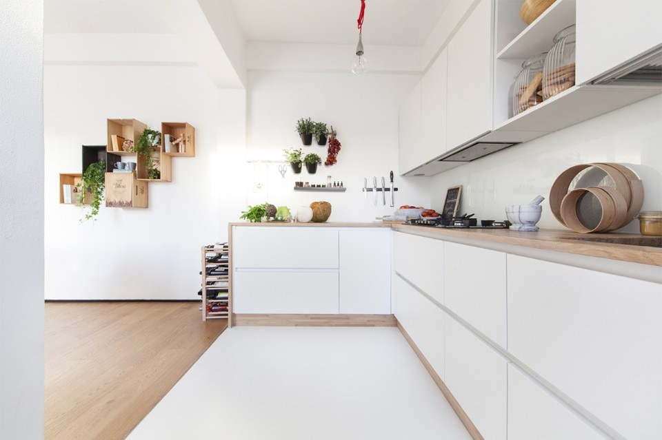 Gli ambienti si sviluppano attorno all’atrio d’ingresso dove si trova una grande apertura vetrata che illumina il bagno. Questo spazio diviene l’interno di un cubo interamente bianco e silenzioso nel quale la percezione dello spazio stesso varia a seconda dell’apertura o chiusura delle porte. La cucina è divisa in zona pranzo e zona cottura. Questa separazione viene marcata anche dal cambio di pavimentazione, da legno a resina bianca.