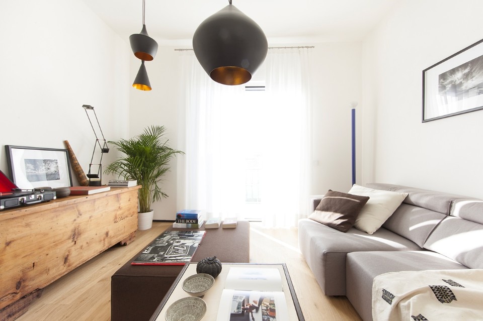 Il soggiorno è interpretato come uno spazio intimo per il relax dove l’illuminazione crea una luce soffusa e concentrata in alcuni punti. Il bagno è stato interamente rifatto, lavorando con superfici in resina bianca, inserti in legno e un elemento di arredo azzurro nella zona doccia. La scelta di materiali e colori ha l’obiettivo di rendere luminoso un bagno privo di finestre.