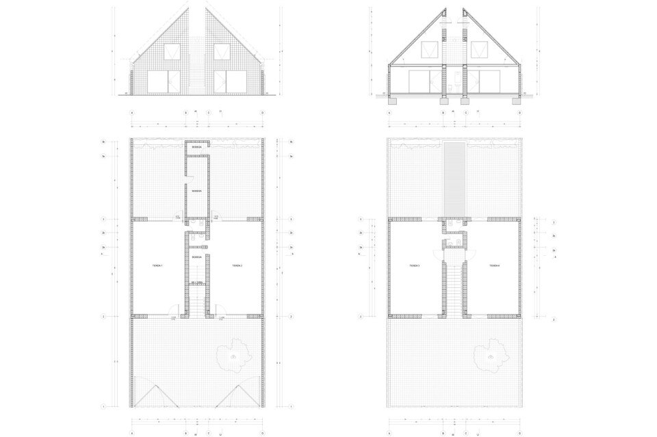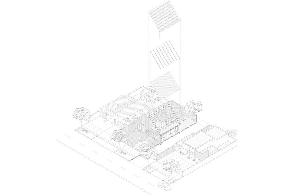La “barra” centrale si estende fino alla fine del lotto (vedi la pianta nella gallery), dividendolo in due parti. Quello che prima ospitava una casa unifamiliare adesso ha l’aspetto di un’abitazione, ma è formato da due edifici che ospitano quattro differenti attività commerciali. L’obiettivo è quello di incrementare la capacità relazionale del sito.