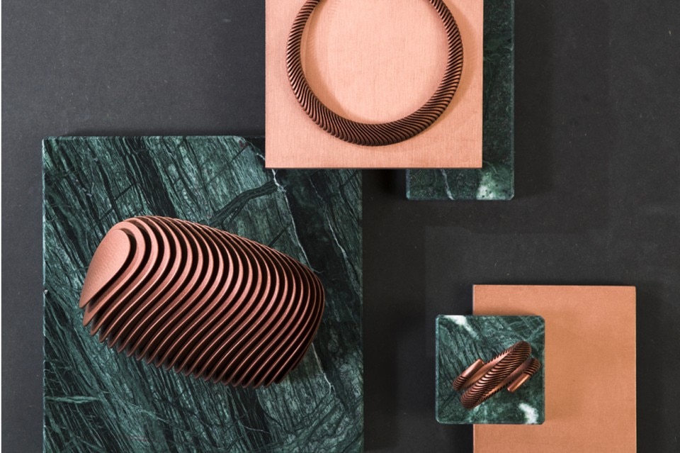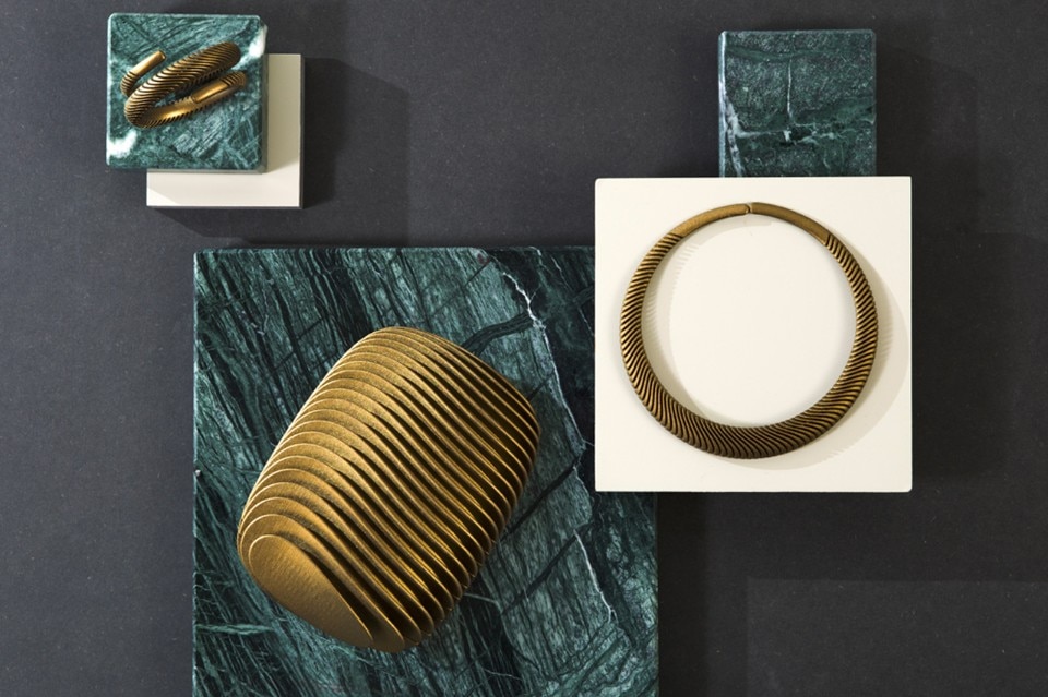 Il risultato visivo è dunque un’alternanza flessuosa e al contempo ordinata di pieni e vuoti, un pattern pulsante e dinamico sviluppato dall’accostamento di linee sinuose e parallele, riprodotte per immortalare l’unicità urbanistica della capitale svizzera. Piccola scultura in stampa 3D, Bern clutch riproduce sulla superficie un effetto optical che le consente di cambiare aspetto a seconda del punto di vista da cui viene osservata e di trasmettere l’immagine di una forma dinamica, sempre in divenire: i rimandi all’urbanistica medievale si trasformano così in un oggetto dall’estetica