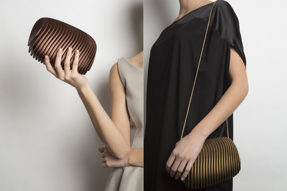 Nella pochette Bern – realizzata in nylon sinterizzato tramite stampa 3D – una serie di lamine tondeggianti sembra nascere a partire da un primo nucleo circolare per poi ampliarsi e dare origine alla clutch, dominata dalla ritmicità strutturale imposta dalle pause fra una forma ovale e l’altra.
