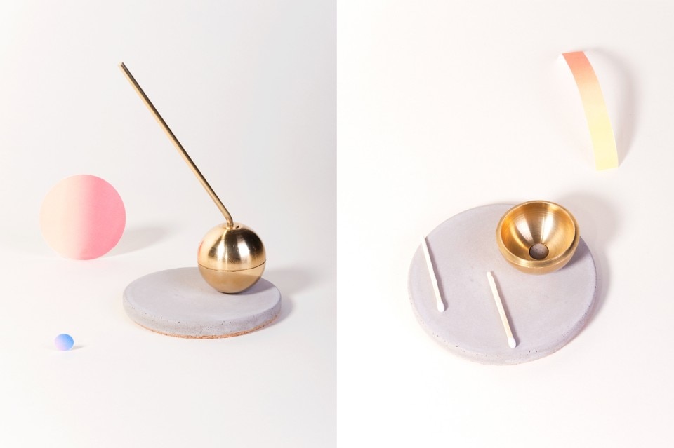 “A partire dal cono classico, abbiamo studiato varie soluzioni prima di scegliere la sfera in ottone, una forma che svolge benissimo la sua funzione e offre una prospettiva diversa”, racconta Ariane van Dievoet, fondatrice di Avandi. La base di cemento, inoltre, offre uno spazio dove appoggiare i fiammiferi.