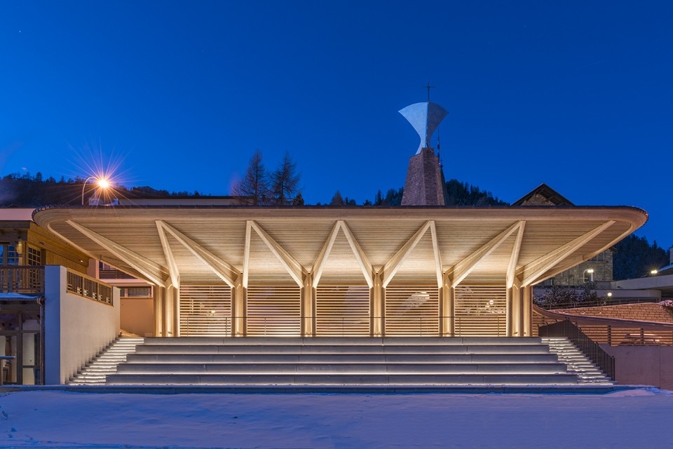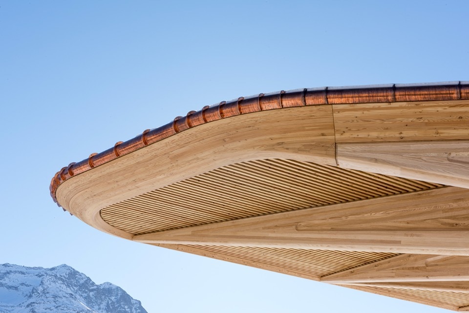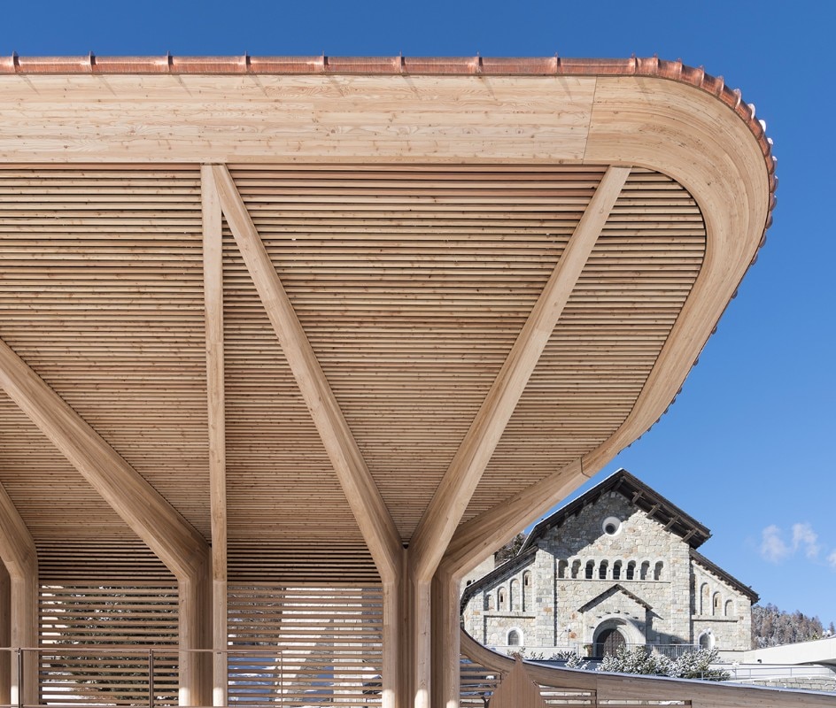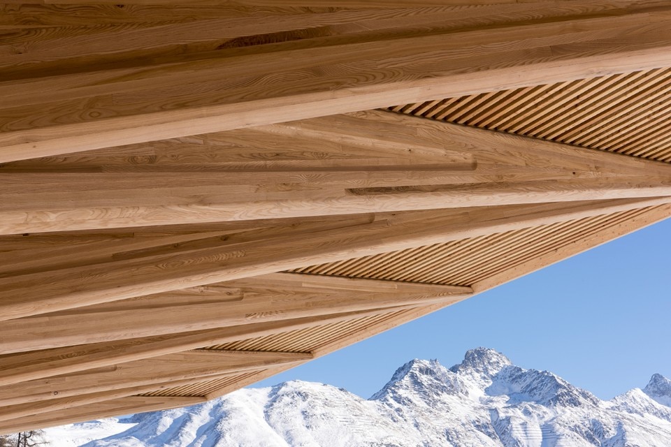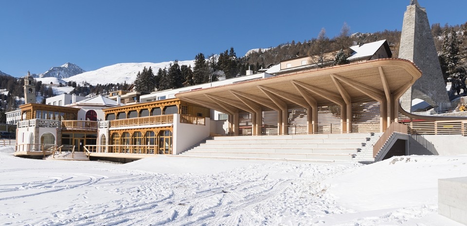 Il progetto si pone in continuità con la tradizione artigianale engadinese, con una tettoia a sbalzo di legno che crea ampi spazi parzialmente coperti, al riparo dalle intemperie. La copertura è fatta di listelli di legno orizzontali che consentono la vista verso il livello della strada. La struttura continua con una parete curva fino all’angolo settentrionale del sito e termina con una pensilina più piccola all’altra estremità. Questo permette la vista verso la pista di pattinaggio e le montagne circostanti dalla strada, proteggendo il sito dai venti freddi che soffiano nella valle.
